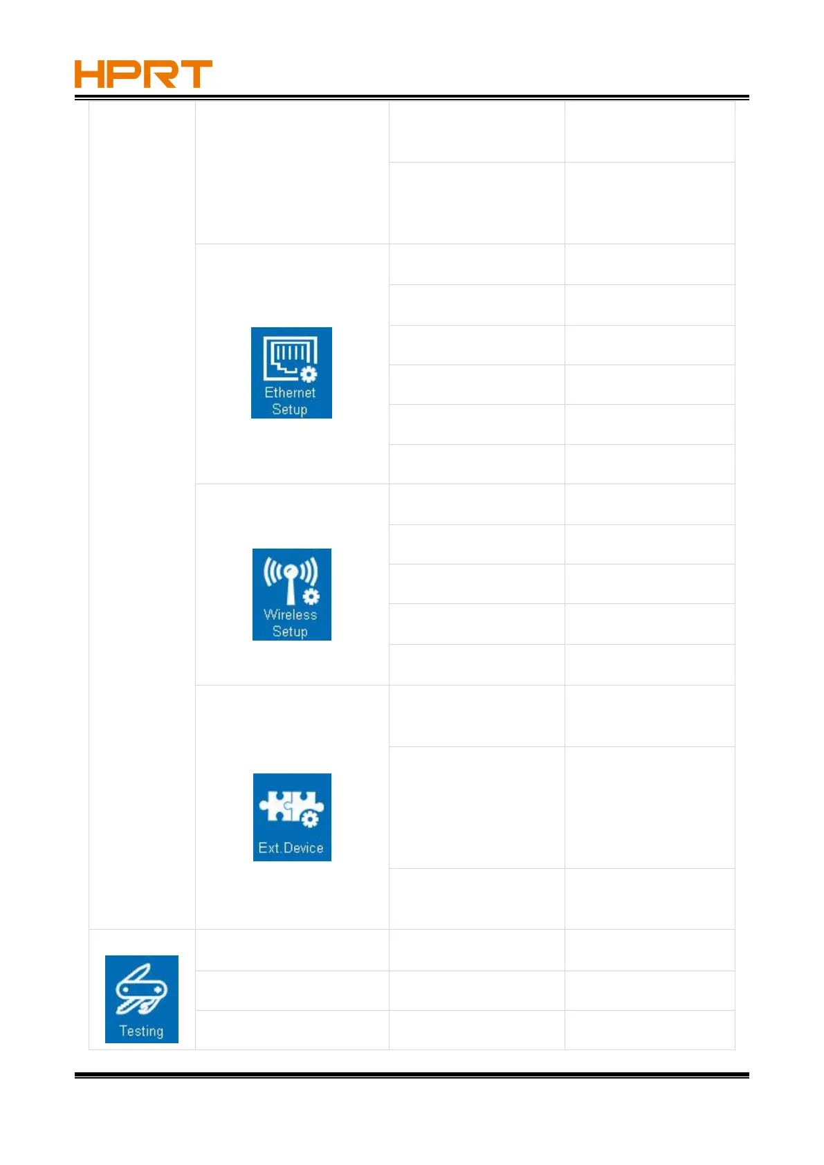 HPRT HT800 - Ethernet Network Configuration; Wireless Network Settings; External Device and Barcode Scanner Settings; Printer Testing and Calibration Functions
