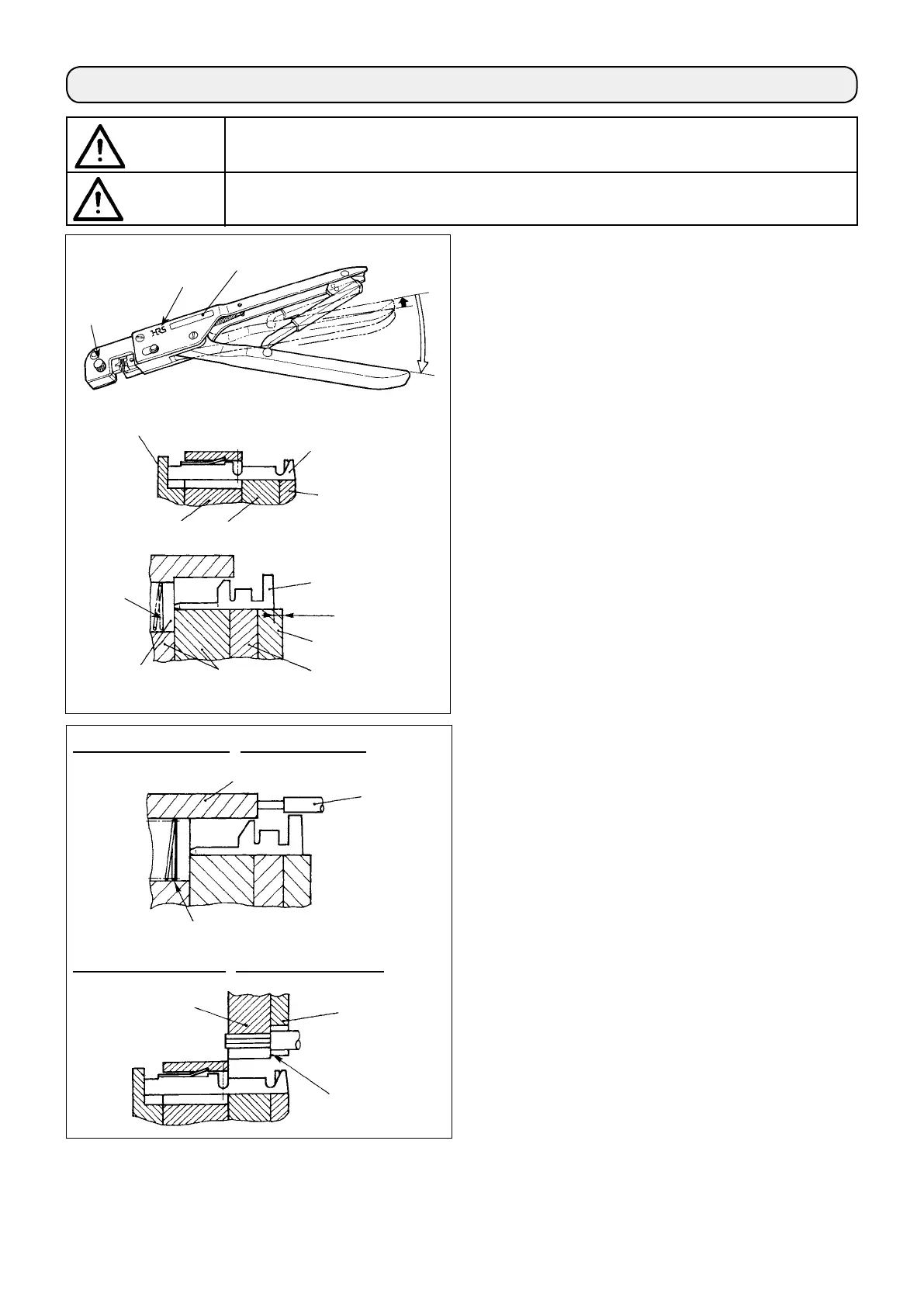 操作中手への損傷防止のため、ハンドルの間や圧着部に指を入れないでください。