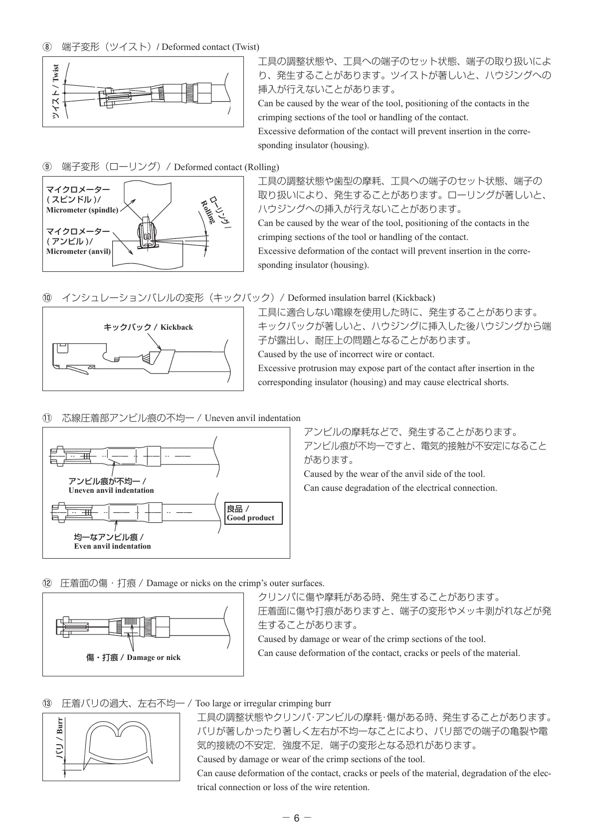 ⑬ 圧着バリの過大、左右不均一 /