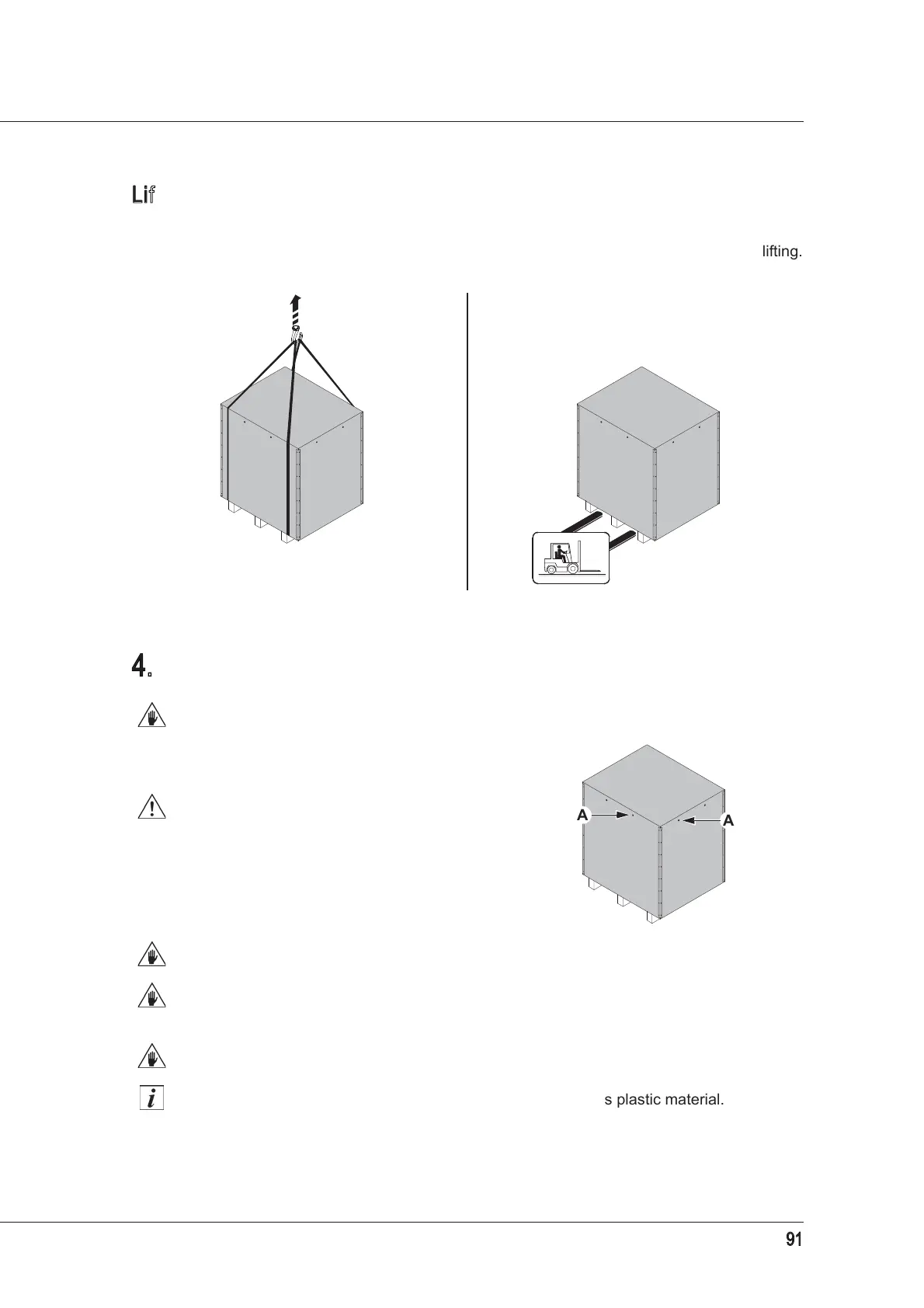case of a forklift, make sure that the centre of gravity of the crate is between the forks when lifting.