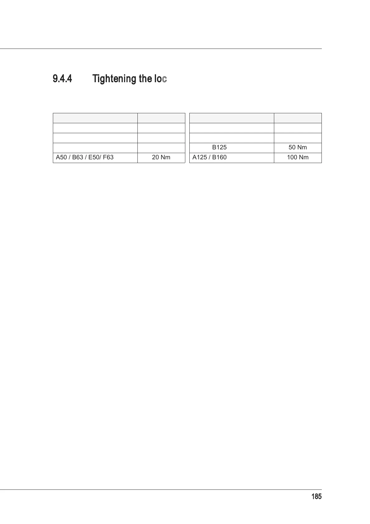 A50 / B63 / E50/ F63 20 Nm A125 / B160 100 Nm