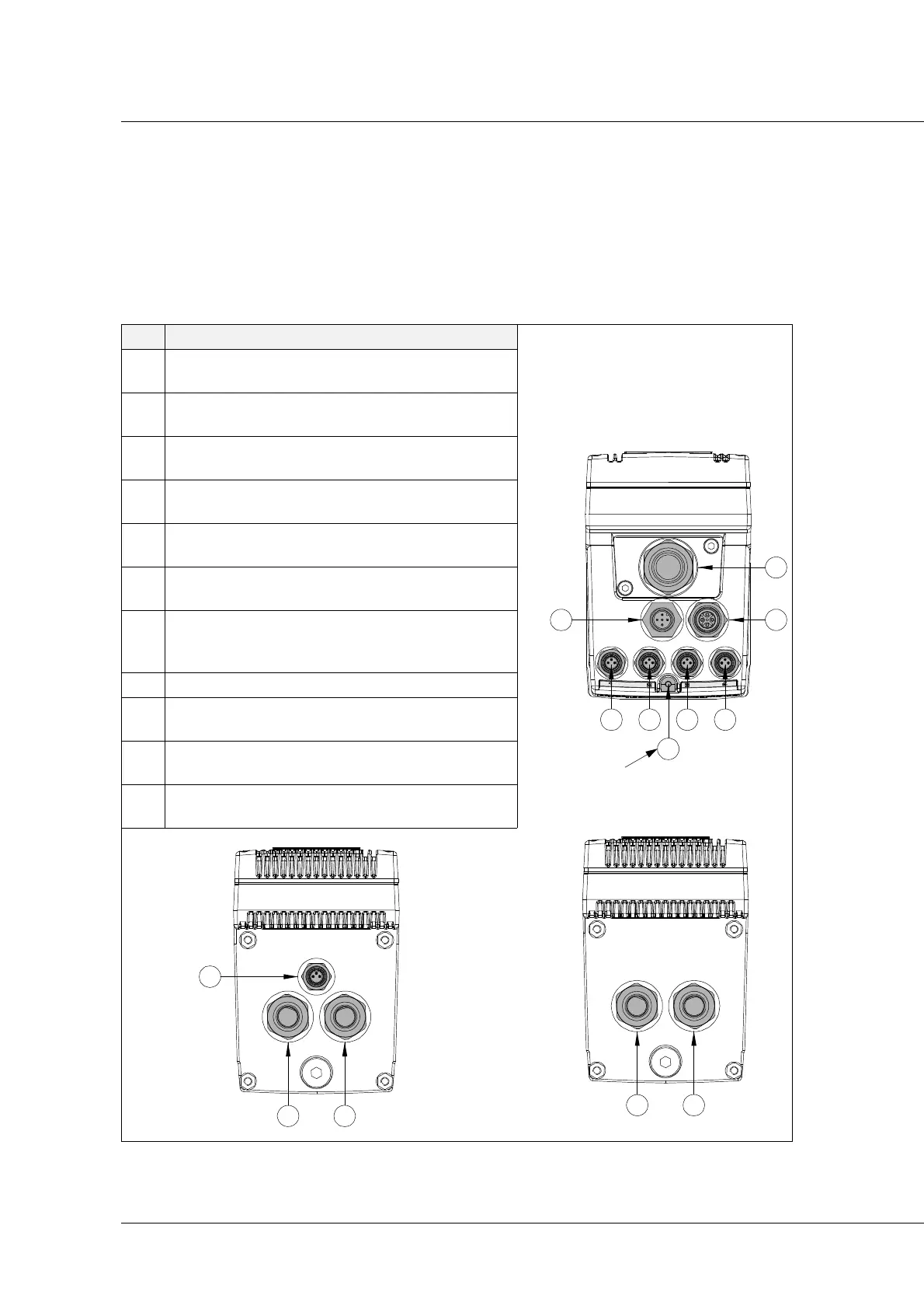 field bus and logic power connectors, ref. 5-IN and 6-OUT, and 4 digital input connectors, ref. 1, 2,
