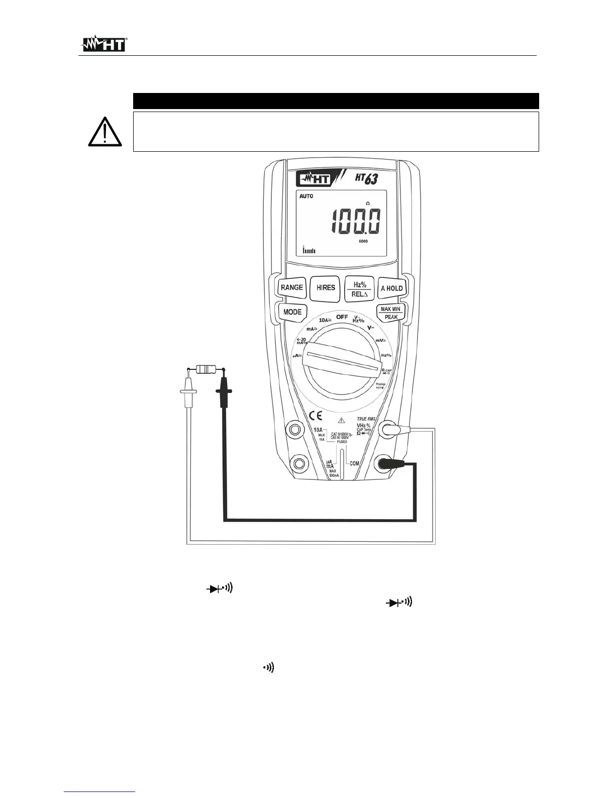 5. Press the MODE key to select “ ” measurement, relevant to the continuity test, and