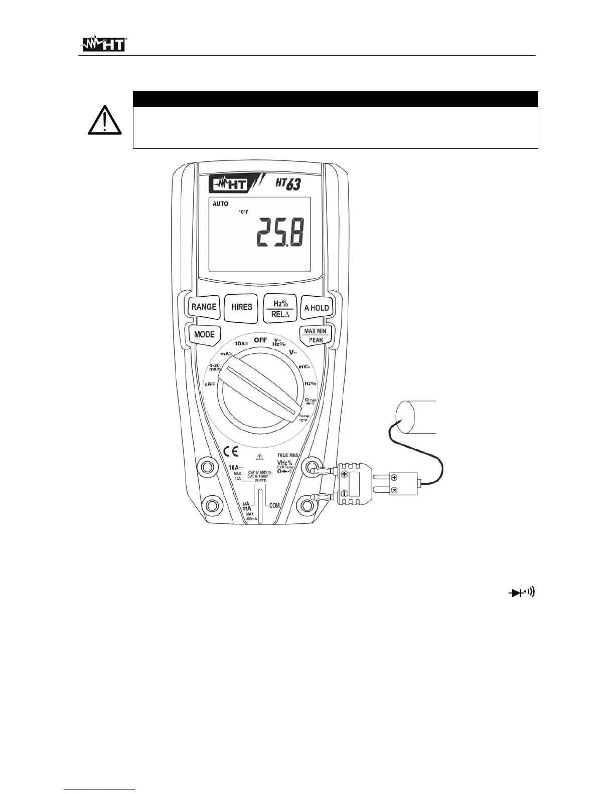 4. Conecte la sonda tipo K en dotación o el termopar tipo K opcional (vea § 6.3.2) en el