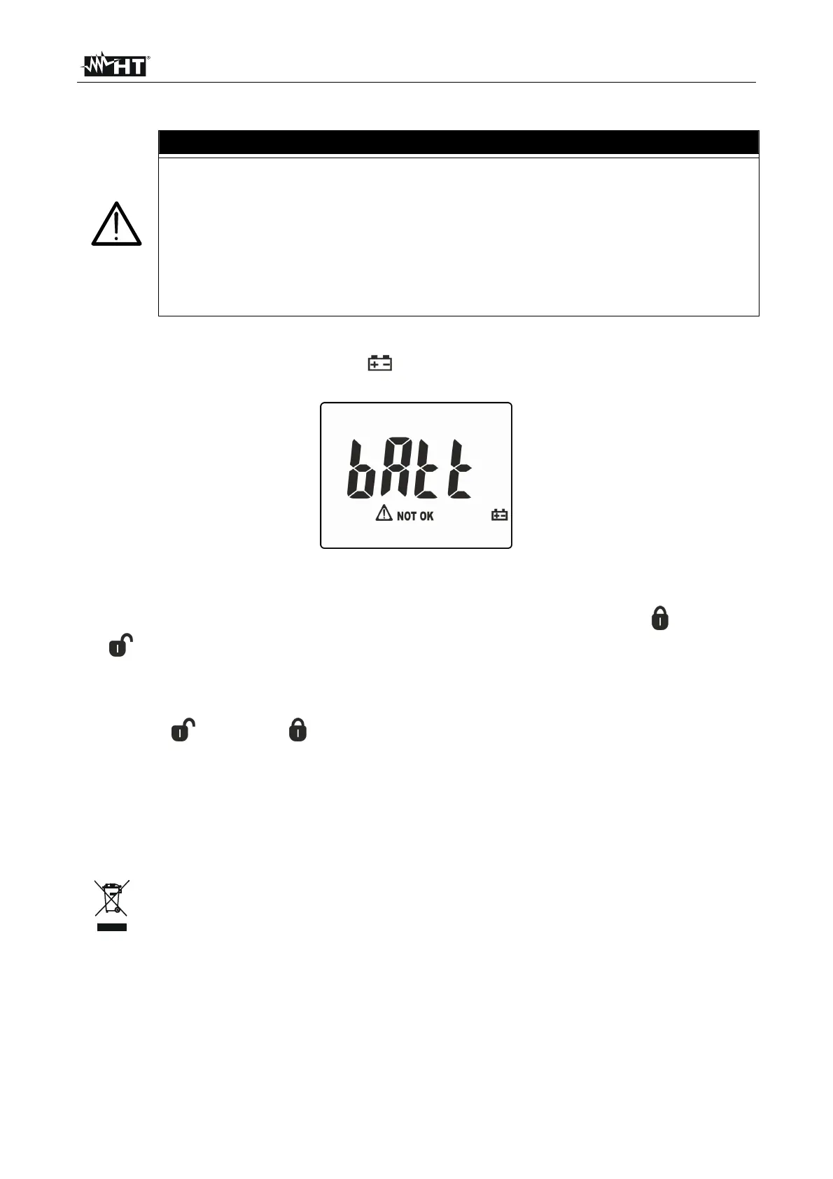 When the LCD display shows symbol “ ” and the indication “bAtt” (see Fig. 43), batteries