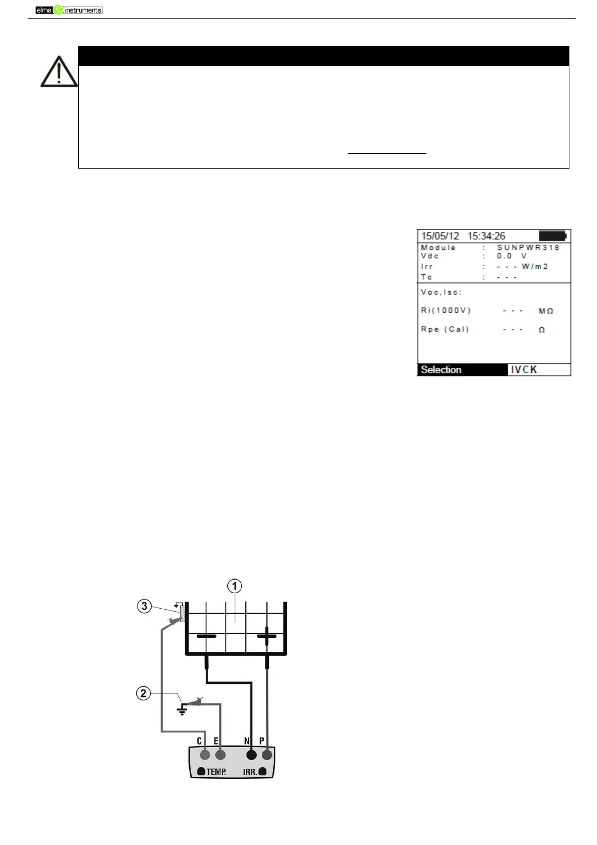 8. Connect the instrument to the module/string being tested and, if necessary, to the main earth