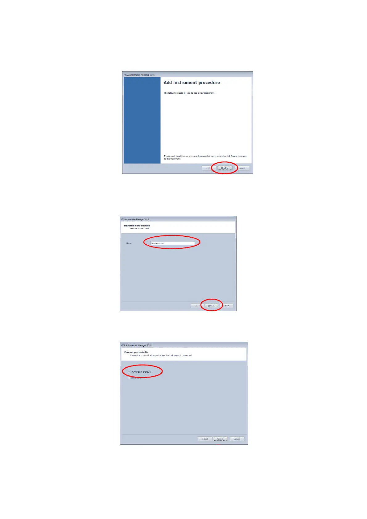 9) Confirm the instrument is connected by "TCP/IP port" (Default) by pressing on “Next”: