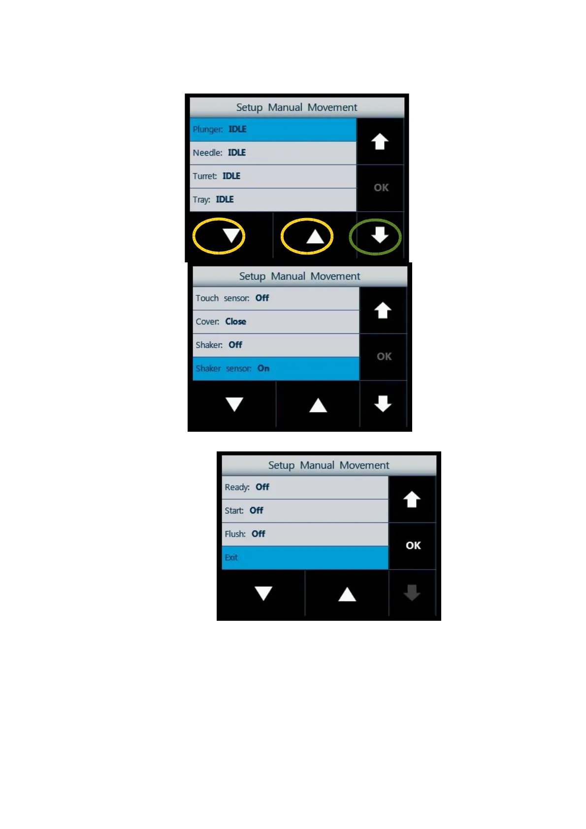 Select a motor using the arrows on the right (green circle), and use the ▲▼ (yellow circle)