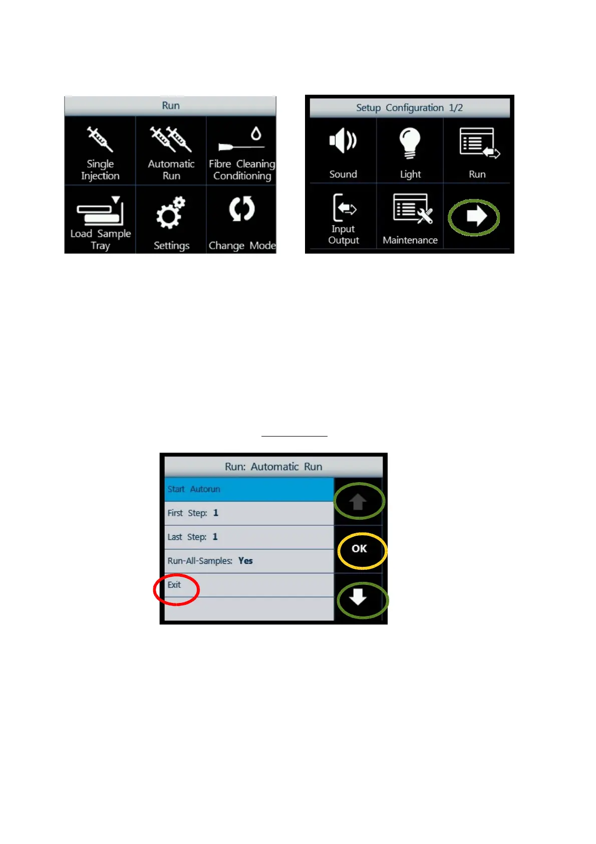 Use the arrows on the right (green circles) to move between the different option/parameters.