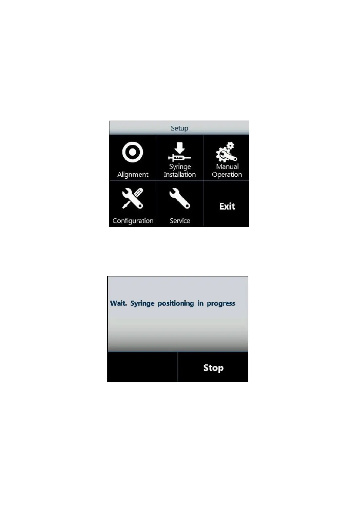 1. From the Setup menu, tap “Syringe installation” to start the procedure: