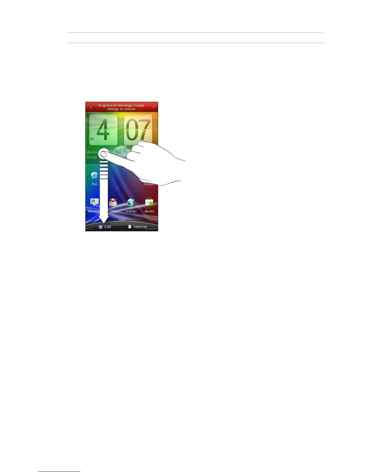 1. Press and hold a widget on the Home screen. HTC Amaze 4G vibrates and you’ll