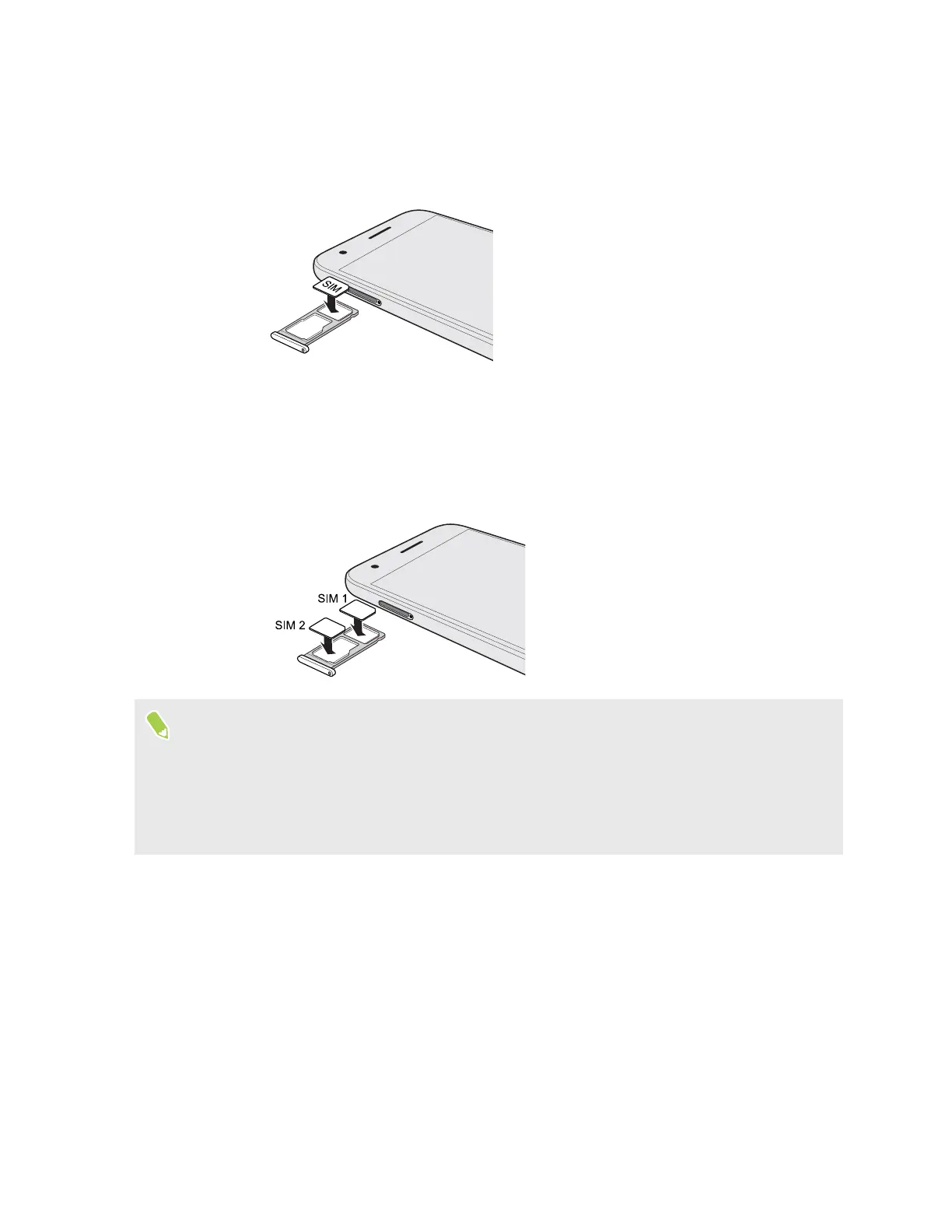 With the gold contacts facing down, place your nano SIM cards into the SIM 1 and SIM