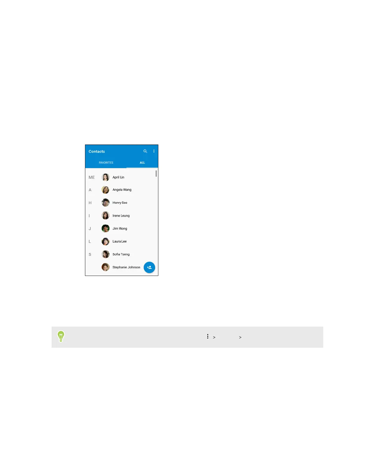The Contacts app lists all contacts you've stored on HTC Desire 12 and from online accounts you're