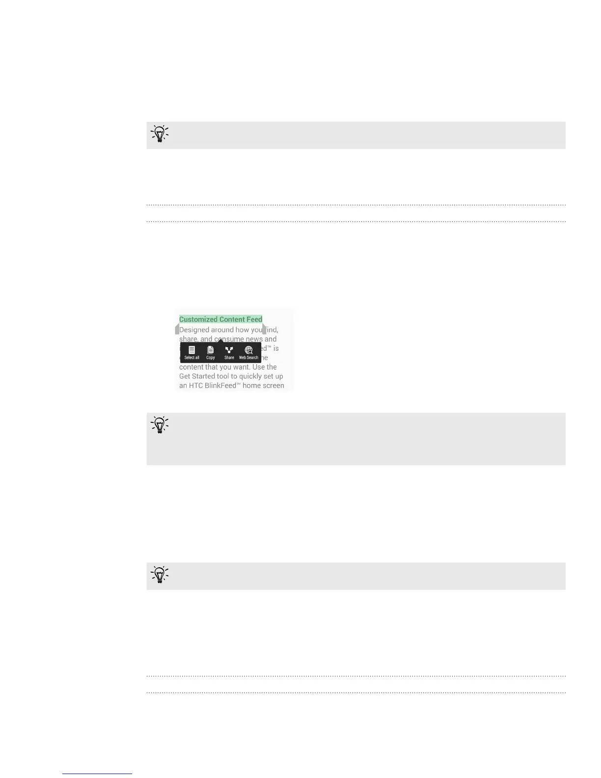 In HTC apps such as Internet and Mail, you can select and copy text, and then paste or