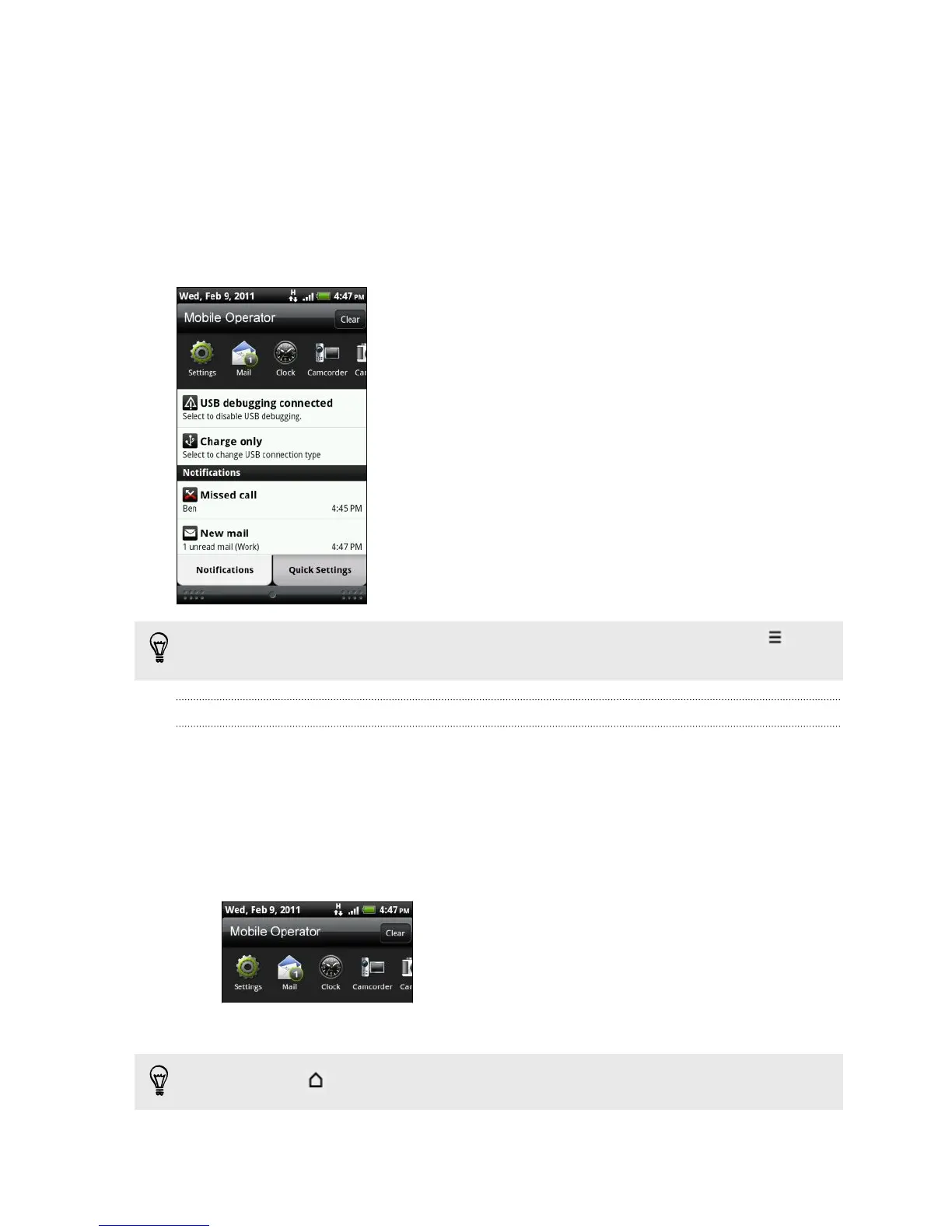 To open the Notifications panel, press and hold the status bar, then slide your finger