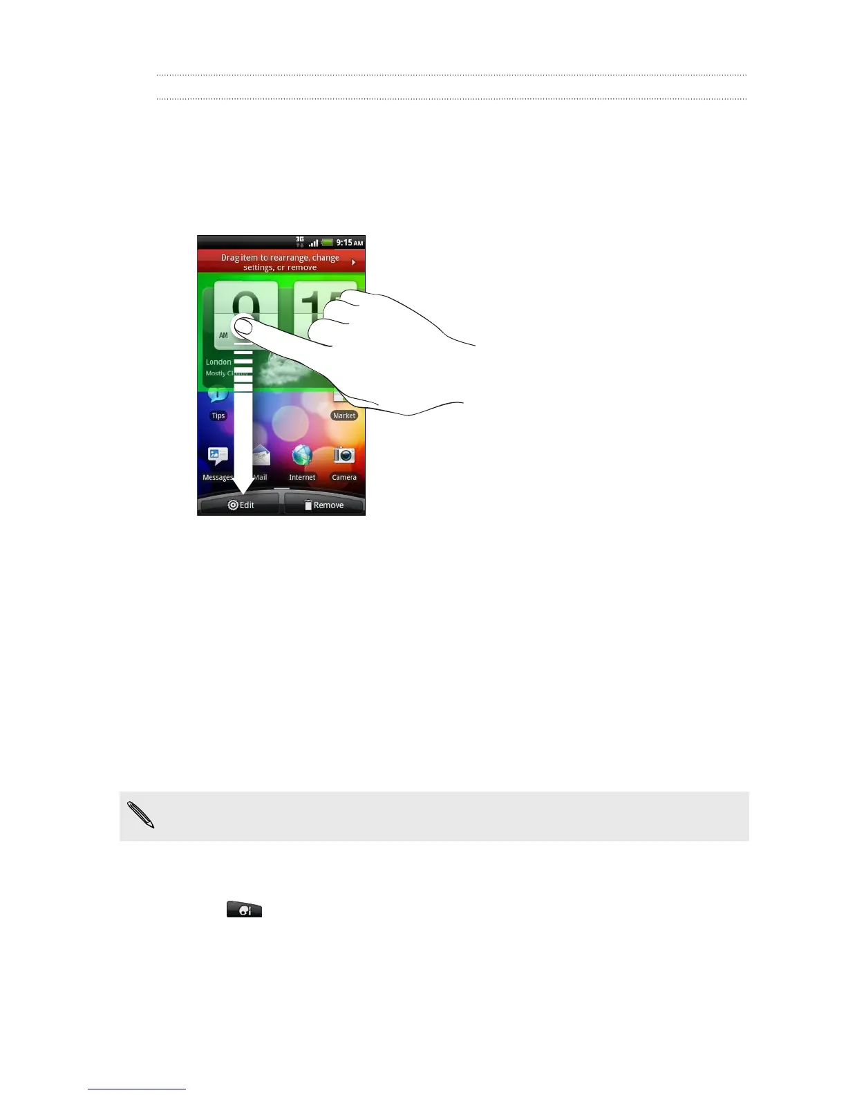 1. Press and hold a widget on the Home screen. The phone vibrates and you’ll see