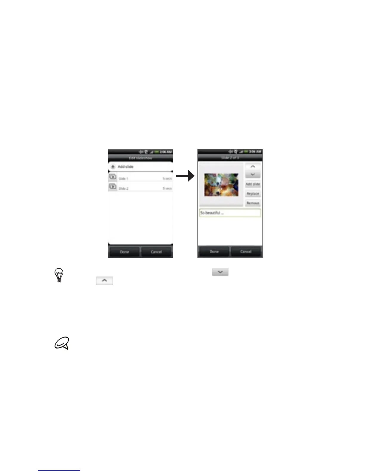 Slideshow. Opens the Edit slideshow screen. Tap Add slide to