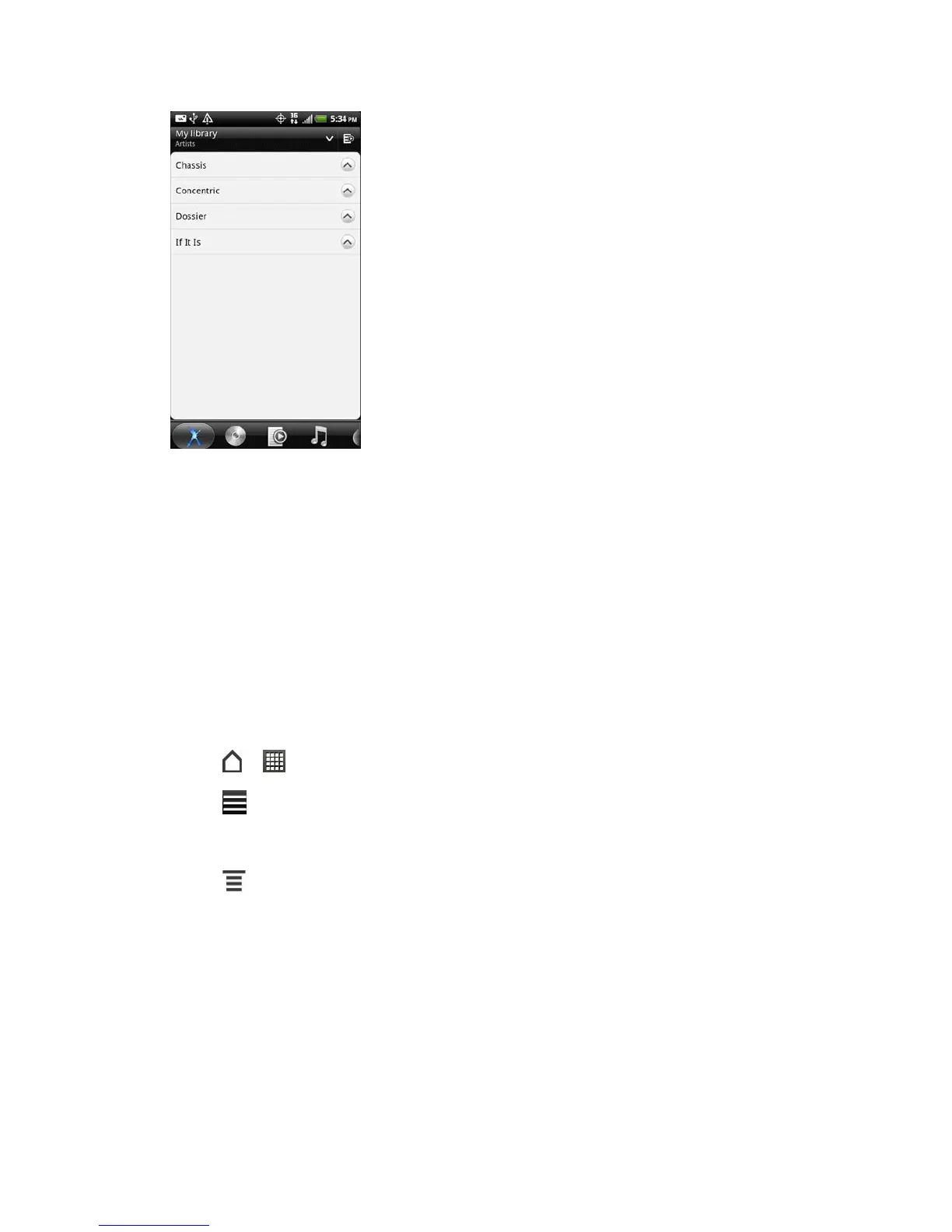 Albums. Select a category by touching one of the tabs at the bottom of the screen.