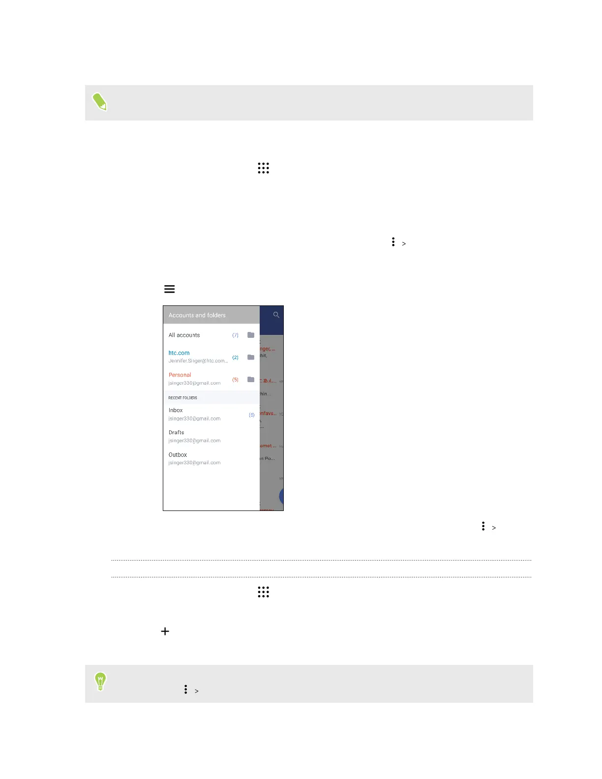 § To switch between email accounts or view email messages from all your accounts, tap