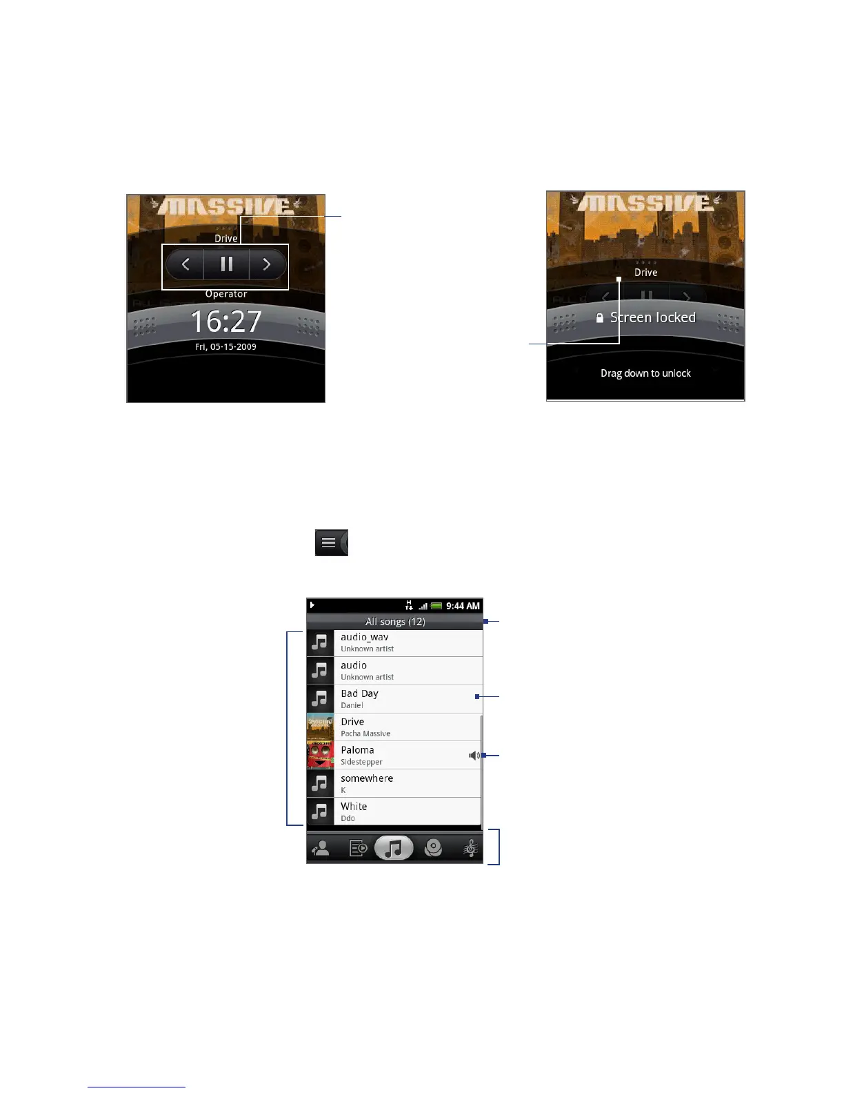 bottom of the screen. Tap a song in the category to play it back.
