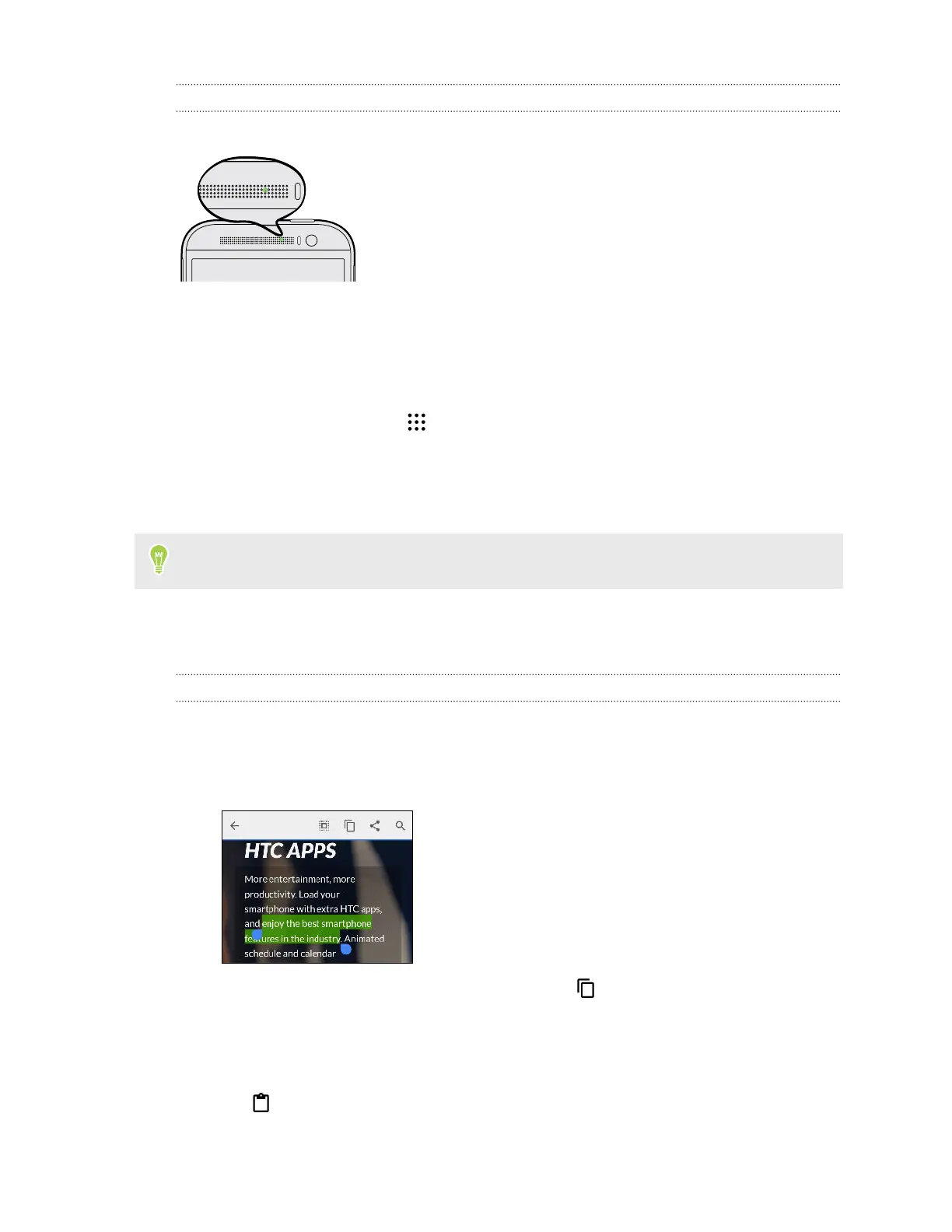In HTC apps such as Mail and Messages, you can select and copy text, and then paste or share it.