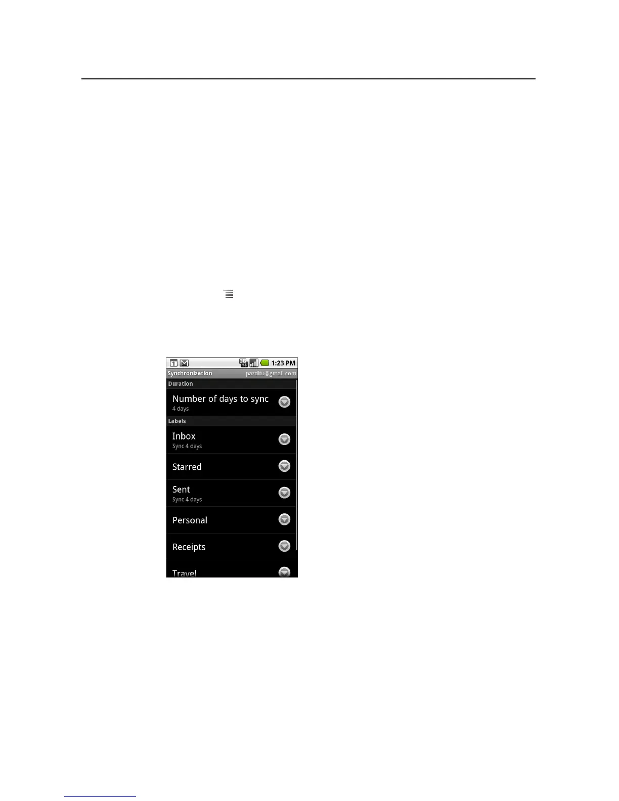 The Synchronization settings screen opens, displaying a scrolling list of your Gmail