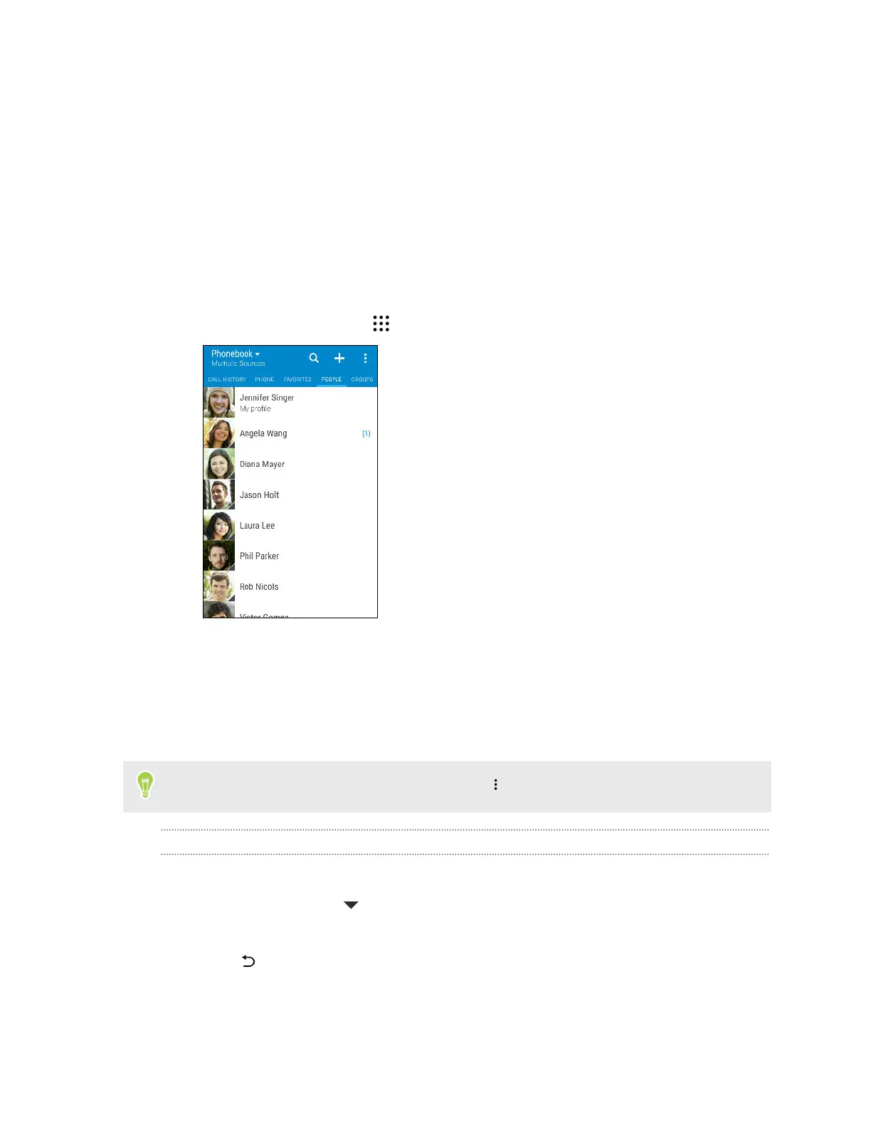 The People app lists all contacts you've stored on HTC One S9 and from online accounts you're