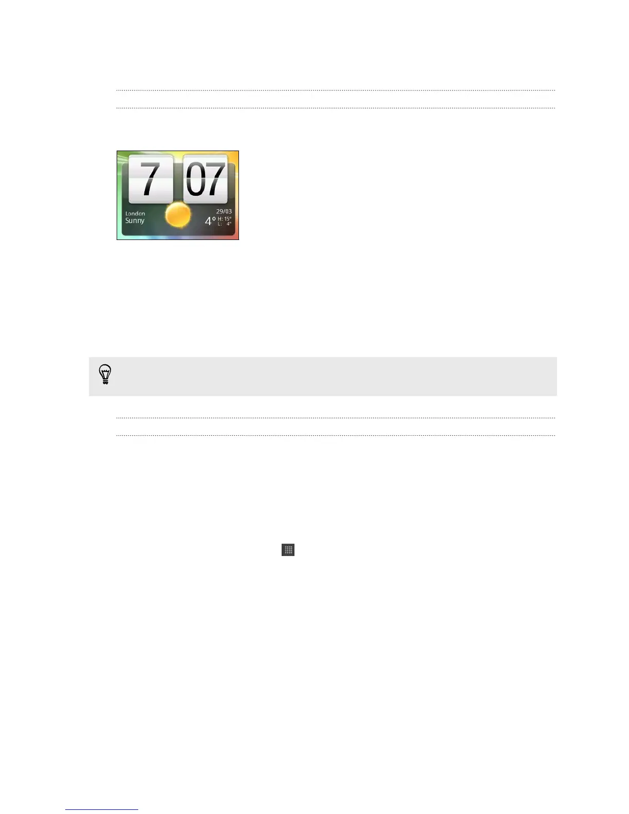 Use the HTC Clock widget to see your current date, time, and location. You can also