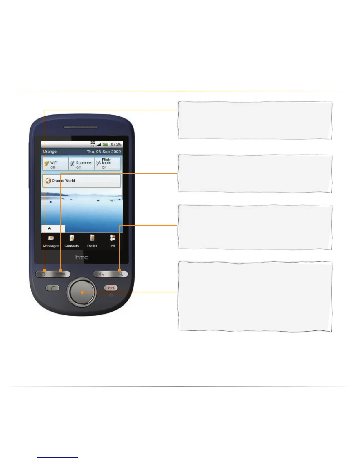 By default, your phone is set to the HTC Homescreen. To switch to the Orange Homescreen,