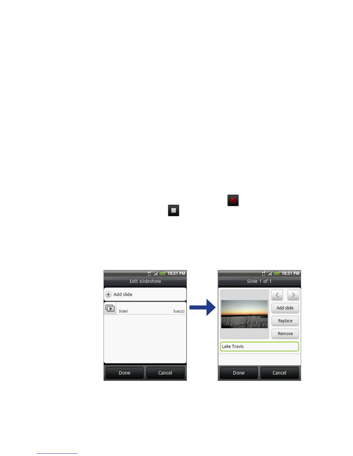 Slideshow. Opens the Edit slideshow screen. Tap Add slide to create