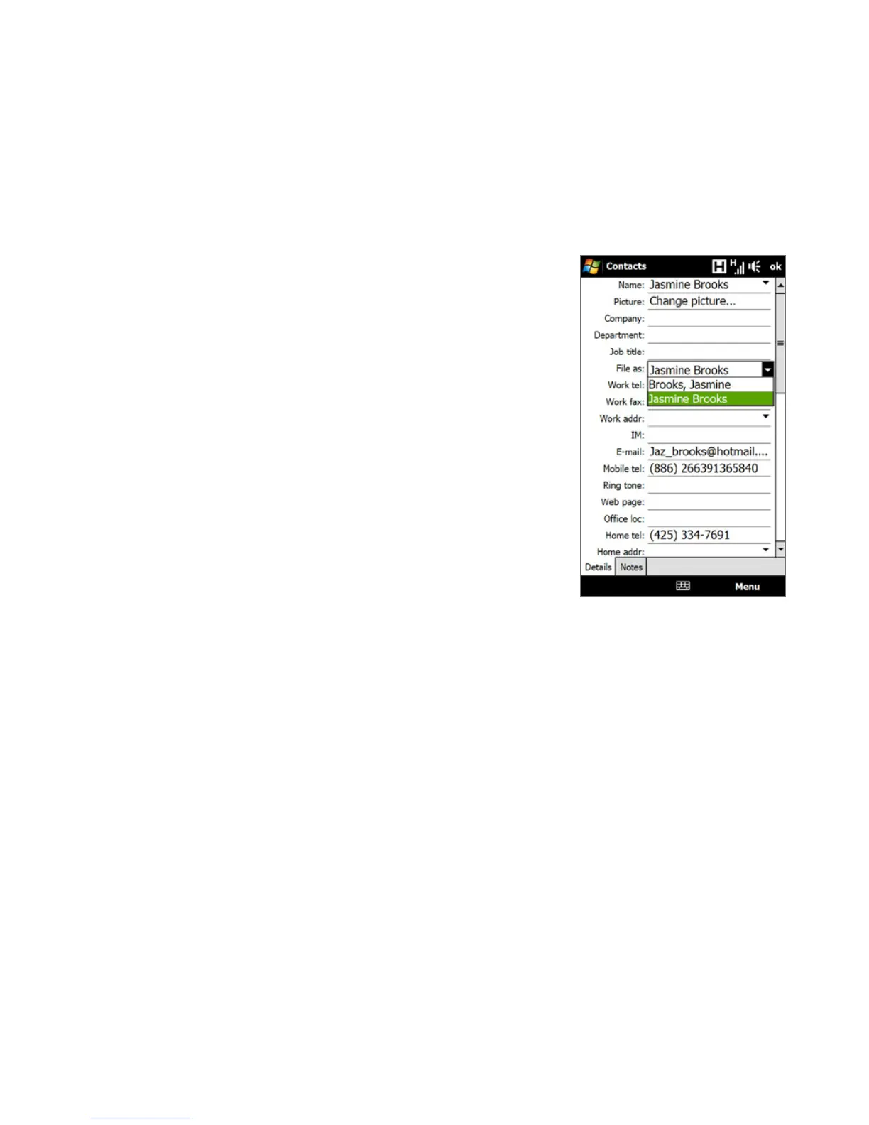 • To edit contact information, tap the contact name and then tap Menu > Edit.