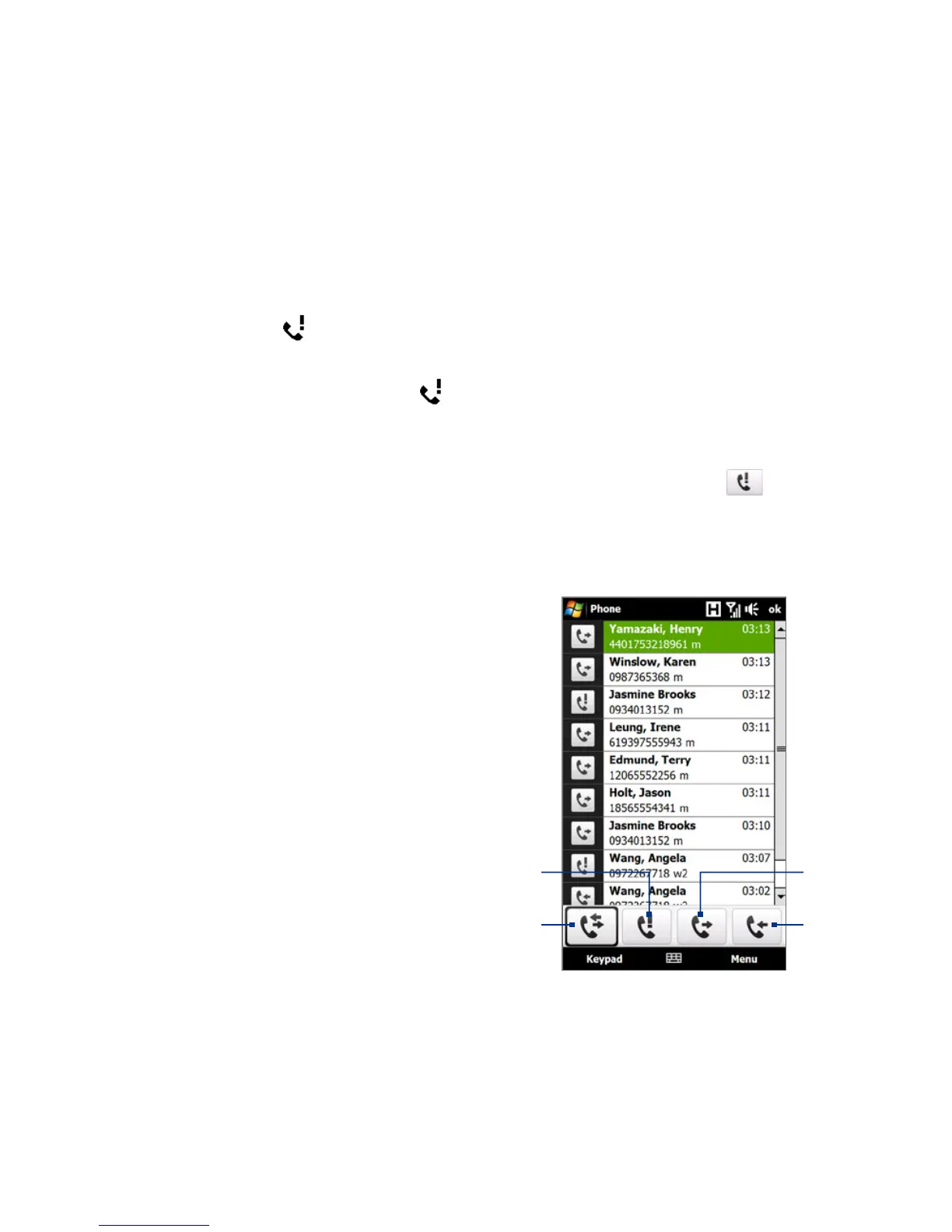 • On the TouchFLO Home tab, tap the Call History or Missed Call item. For