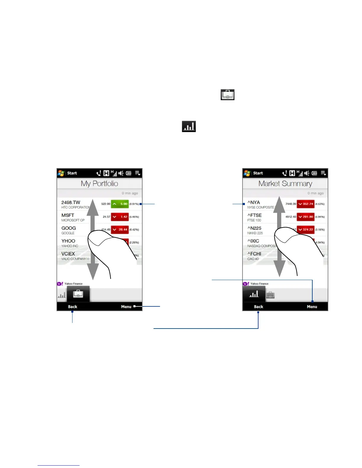 screen. My Portfolio lists all your stock quotes. Touch Menu to add, delete, or