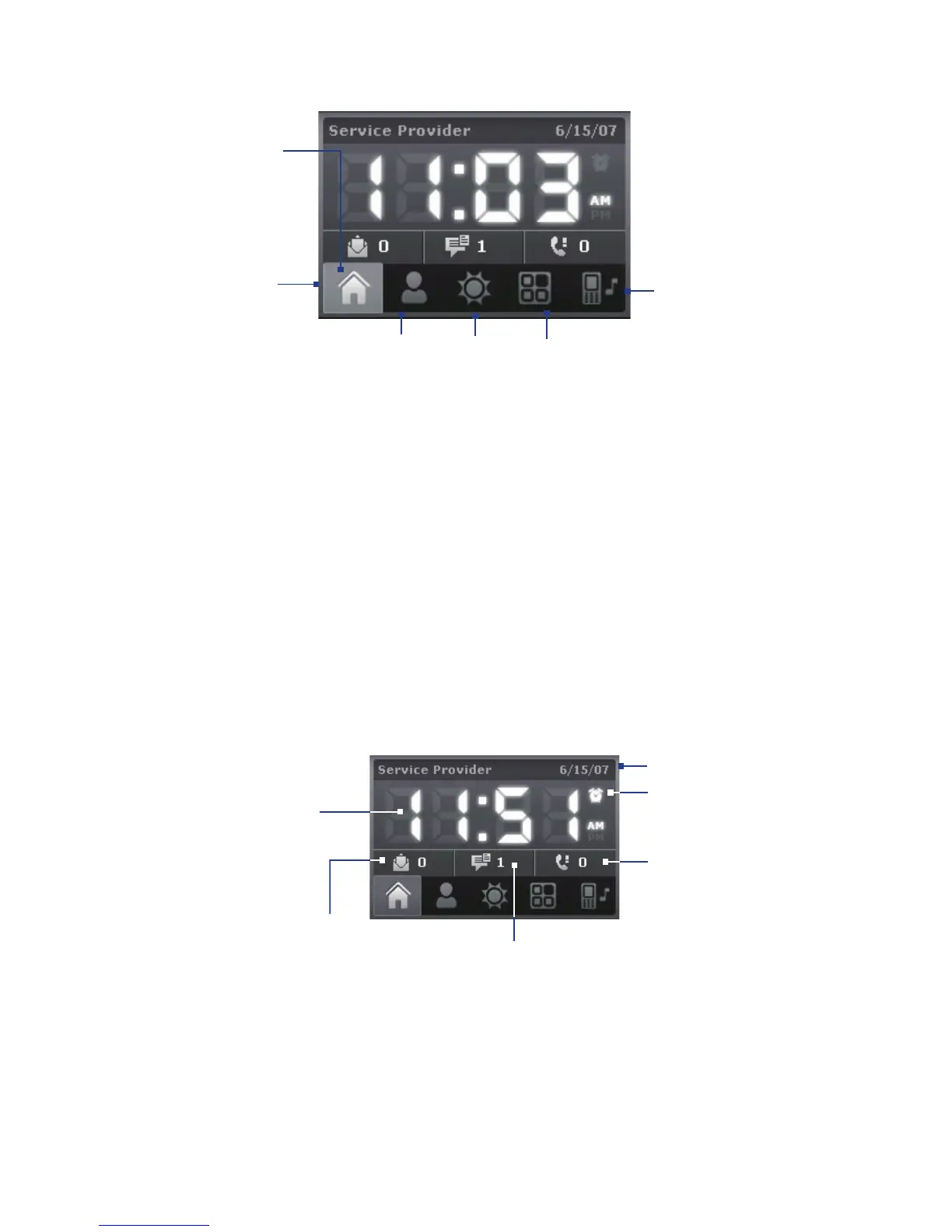 SMS/MMS messages, and missed calls. If you have set up the alarm, it also