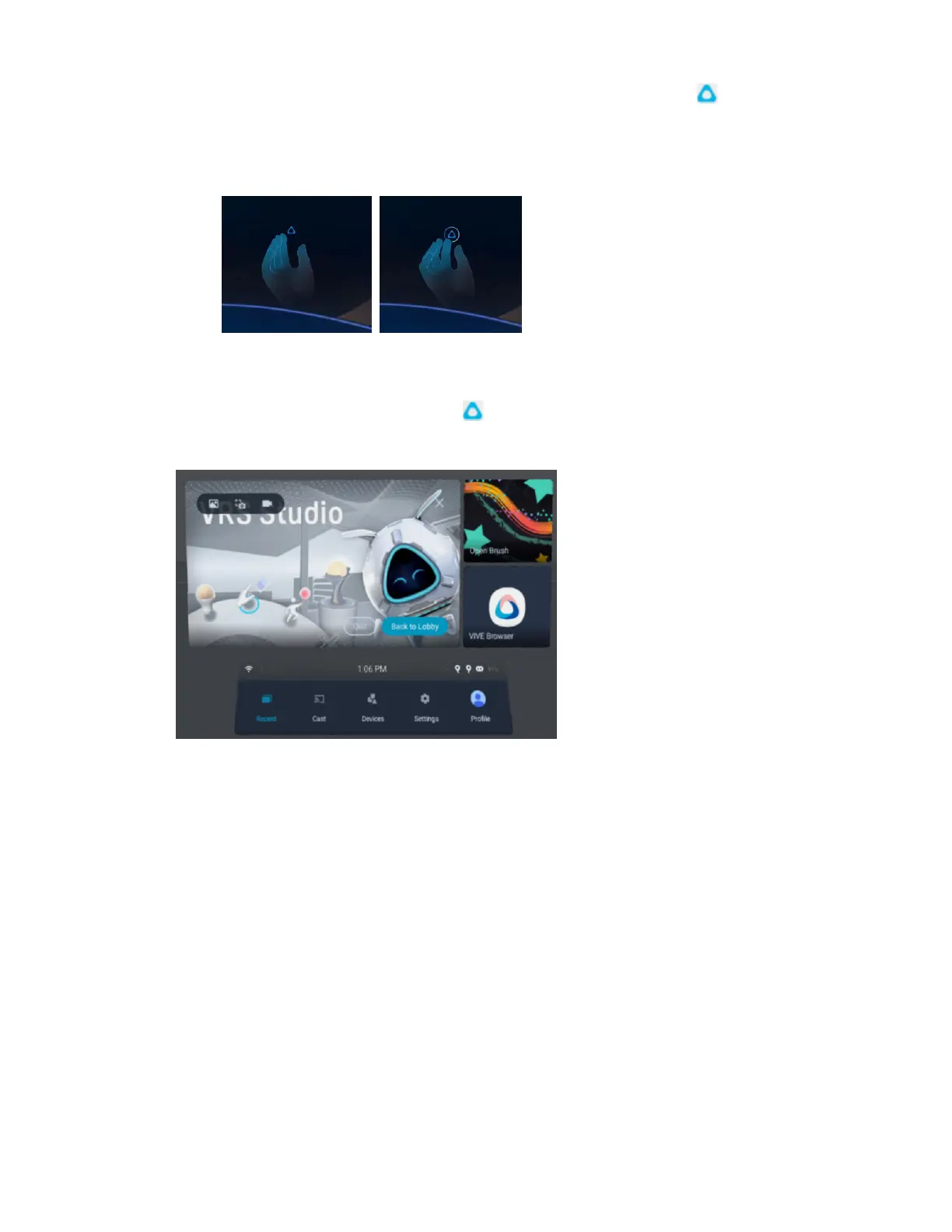 § Hand gestures: Face your right palm inward. When the VIVE symbol appears, pinch