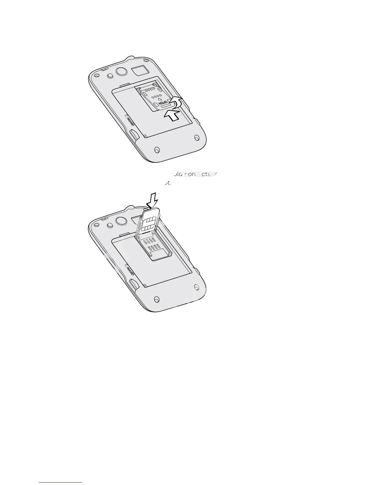 4. Insert the SIM card with its gold contacts facing down and its cut-off corner