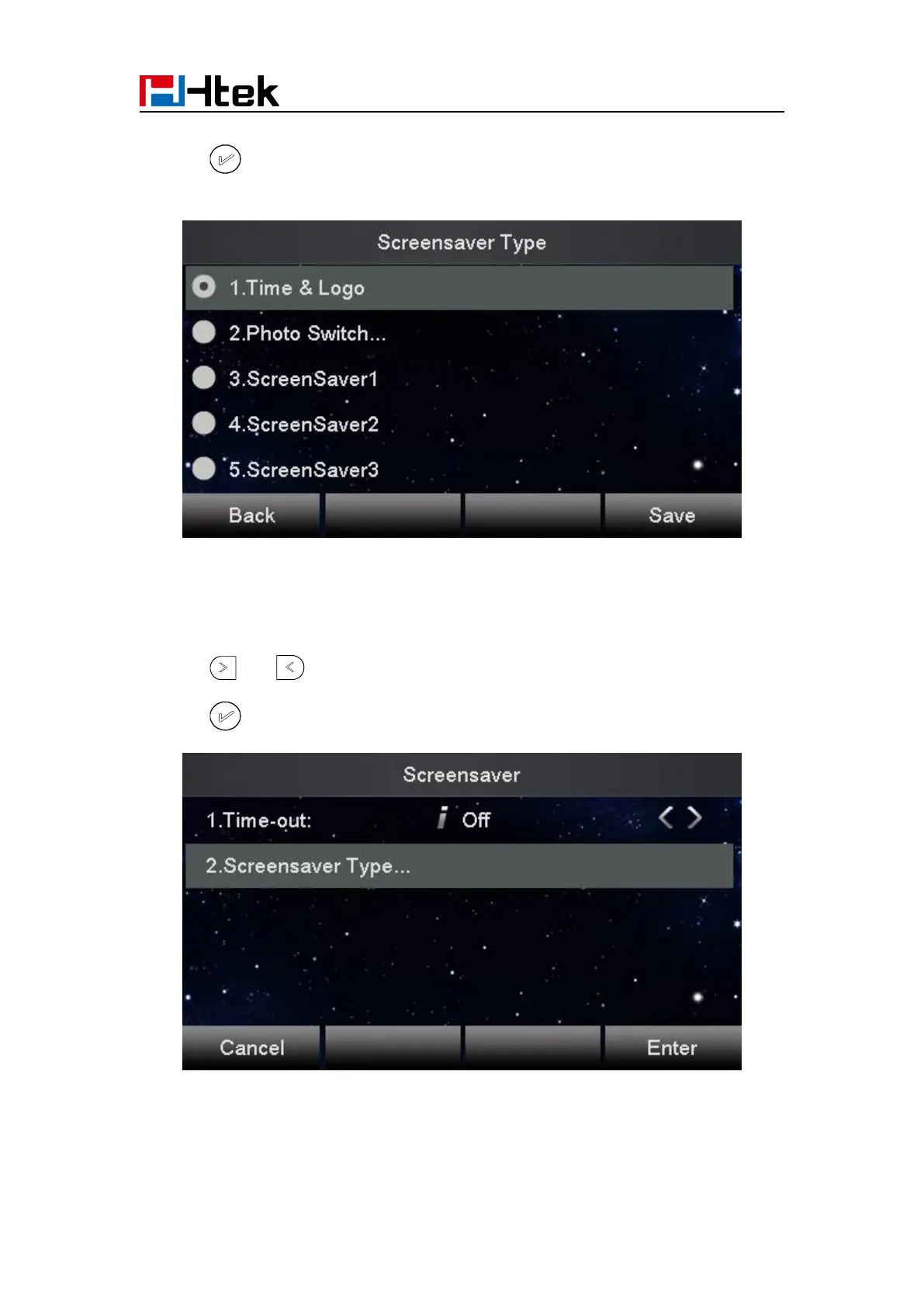 3. Enter the Screensaver Type to choose one of the type: Backlight off, Time & Logo and Photo