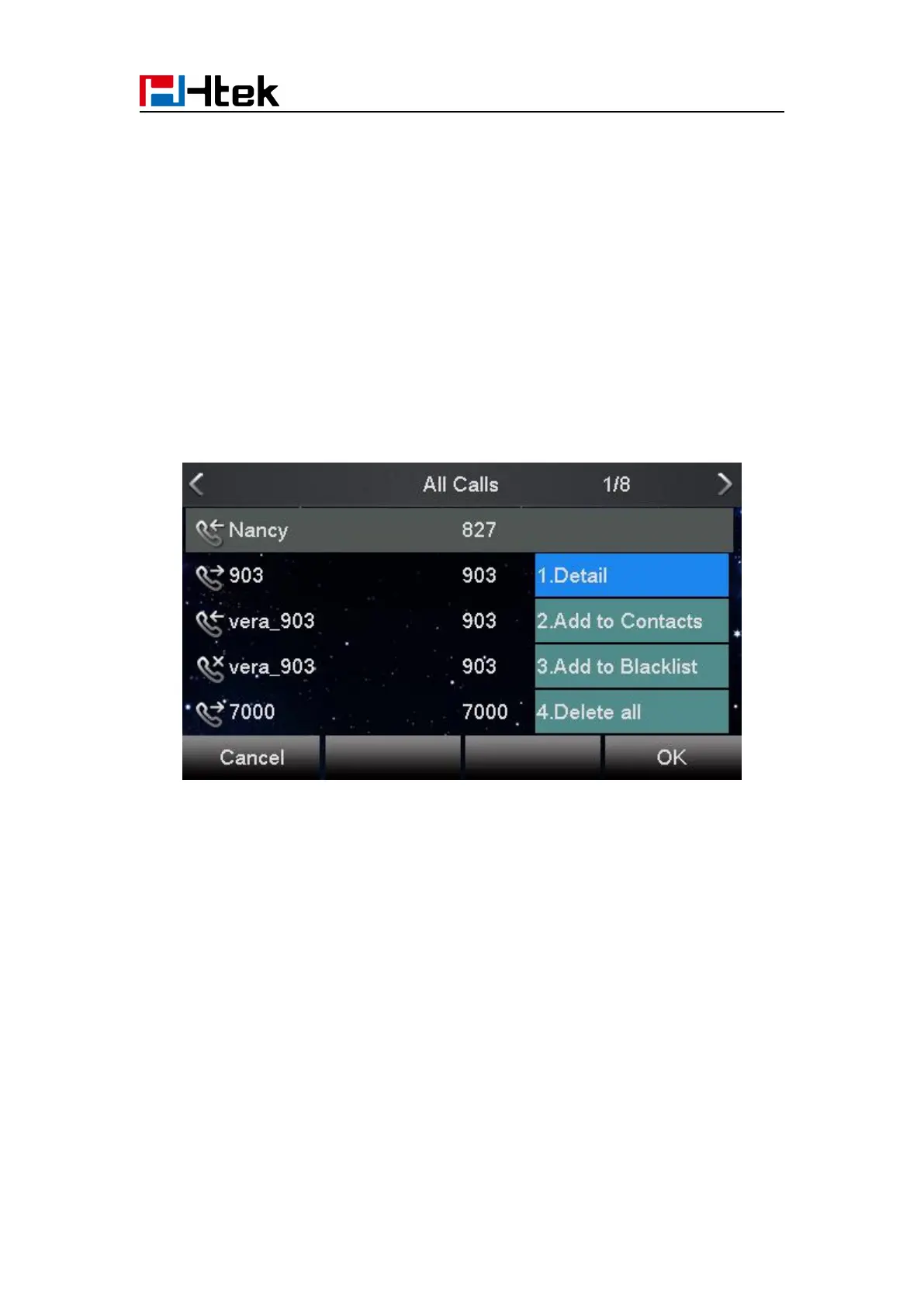 2. Press Right or Left Key to switch among All Calls, Missed Calls, Received Calls, Dialed