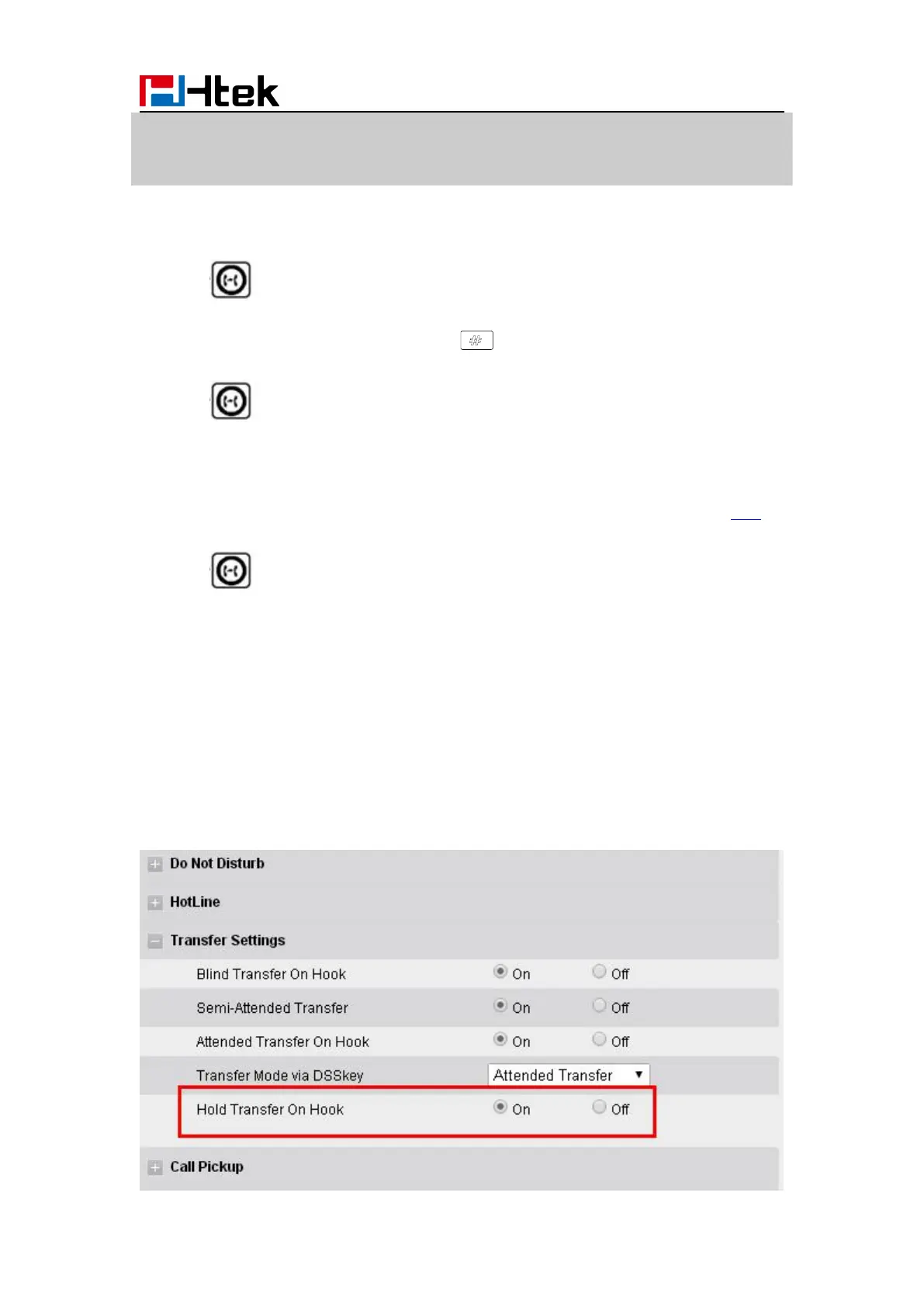 1. Setting Features Transfer Setting: Hold Transfer On Hook: ON.