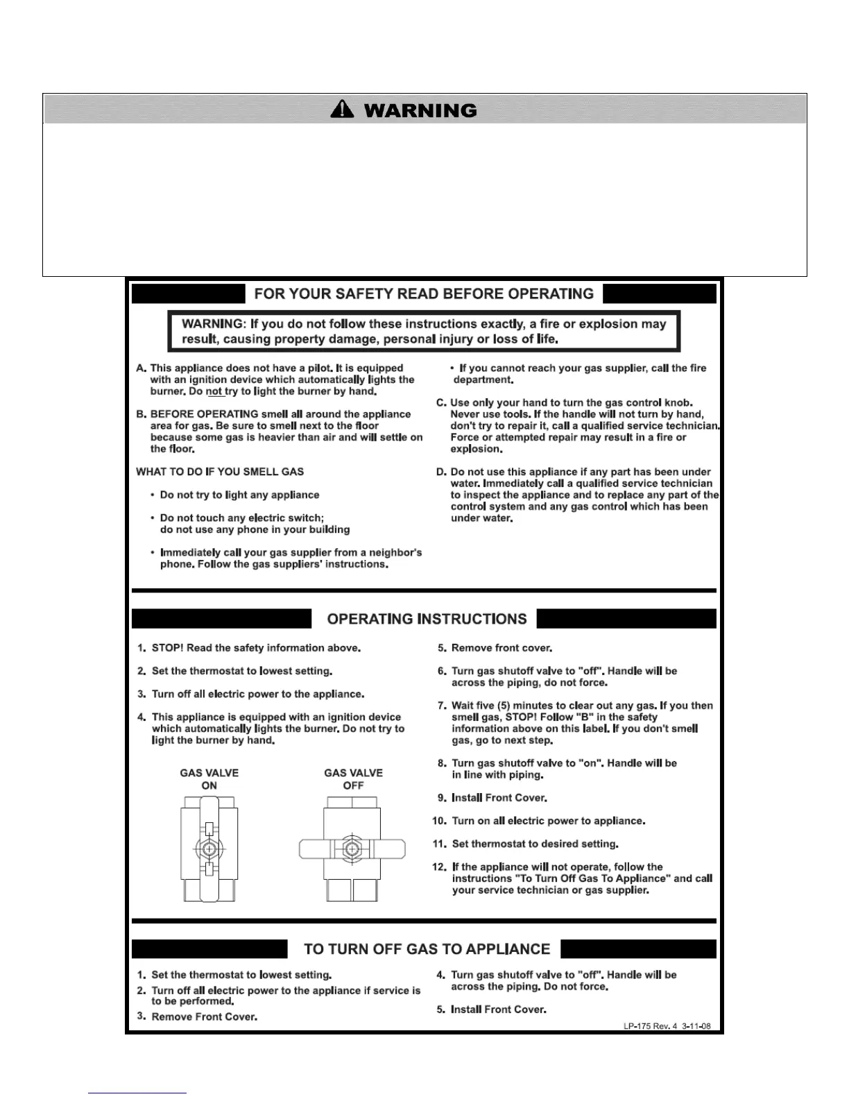 IF THE INFORMATION IN THIS MANUAL IS NOT FOLLOWED EXACTLY, A FIRE OR EXPLOSION MAY RESULT, CAUSING