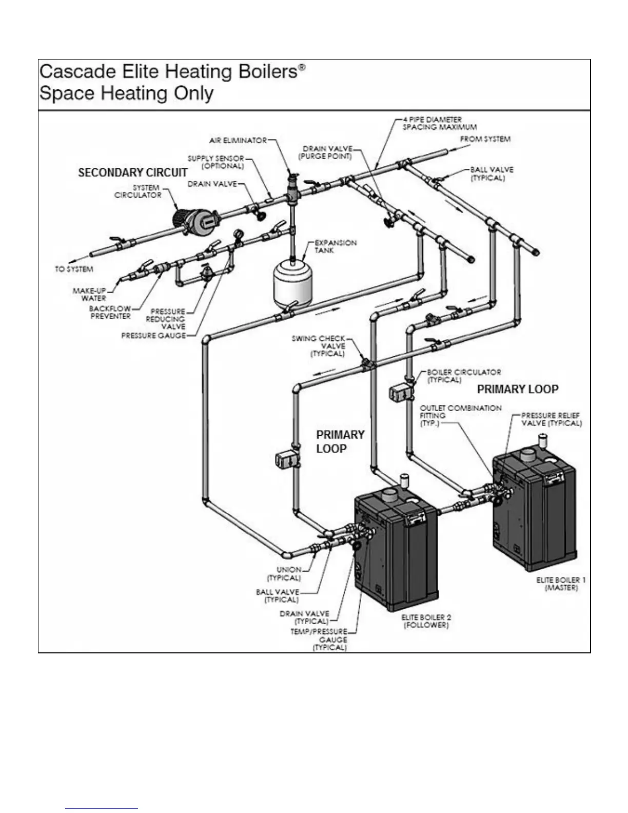 4. System flow (secondary loop) should be greater than the boiler primary loop flow. In all cases, the boiler primary loop flow rate must