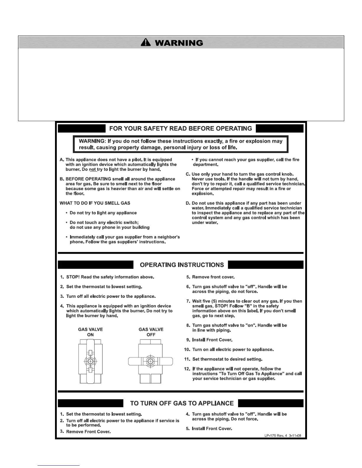 IF THE INFORMATION IN THIS MANUAL IS NOT FOLLOWED EXACTLY, A FIRE OR EXPLOSION MAY RESULT, CAUSING