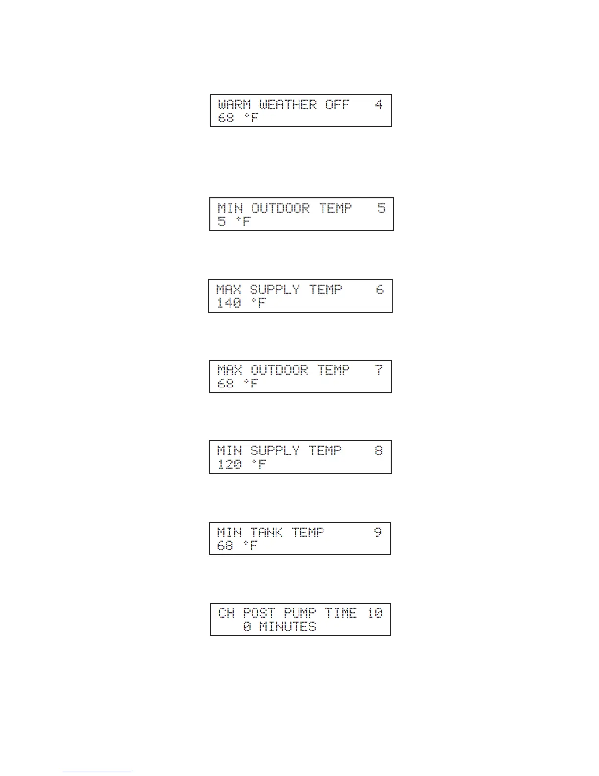 Description: Allows the user to set the minimum tank temperature. Factory default 68