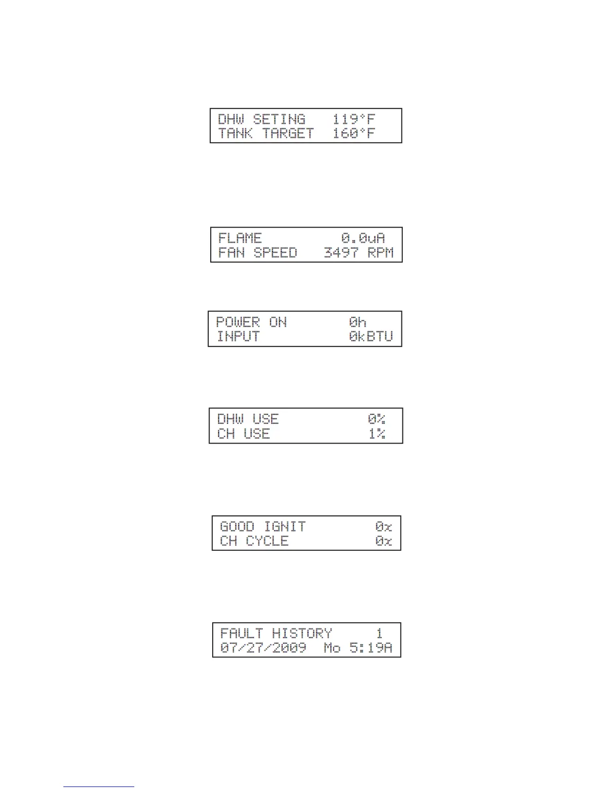This screen displays the last lockout fault the heater control had. The top line will alternate between the