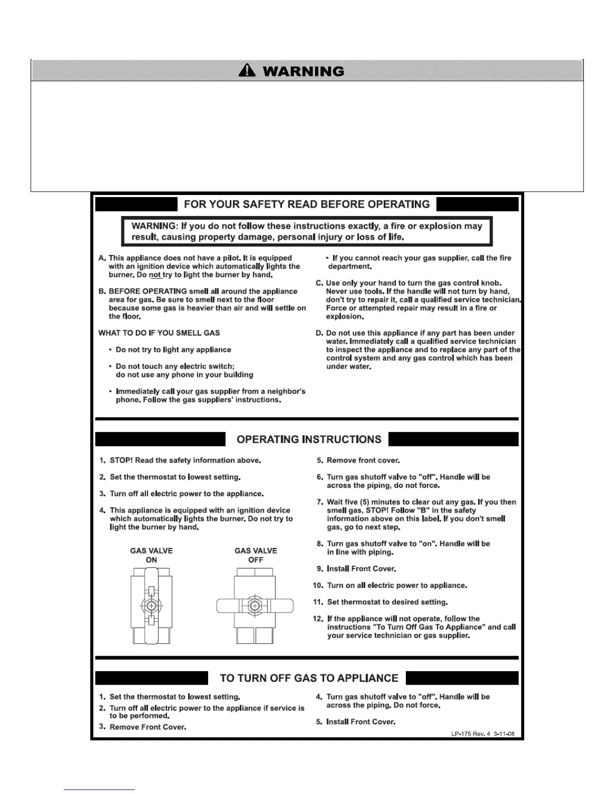 IF THE INFORMATION IN THIS MANUAL IS NOT FOLLOWED EXACTLY, A FIRE OR EXPLOSION MAY RESULT, CAUSING