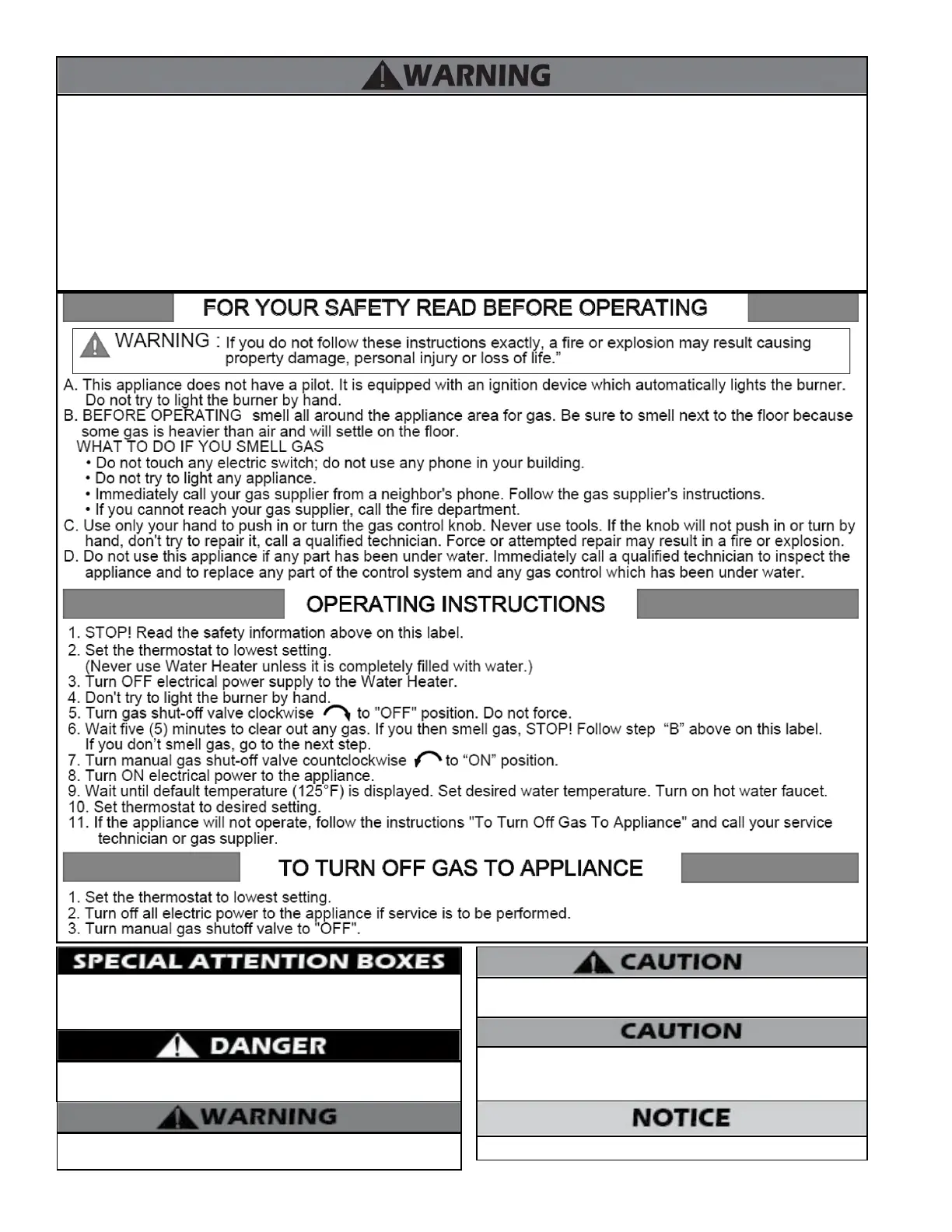 WARNING: If the information in these instructions is not followed exactly, a re or explosion may result causing property damage, personal