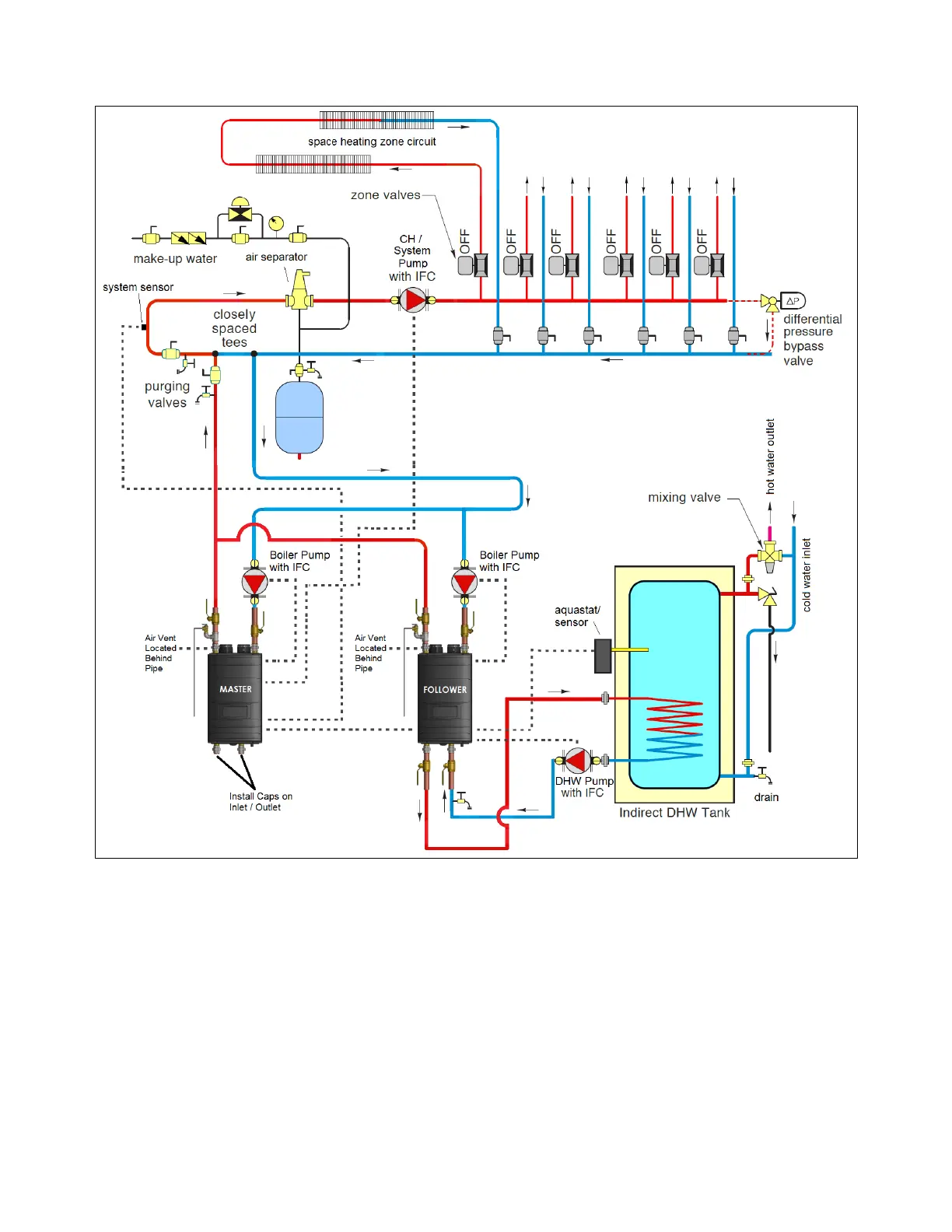 Figure 27 – Cascaded System - Zoning with Zone Valves and Indirect Water Heating – Primary / Secondary Shown