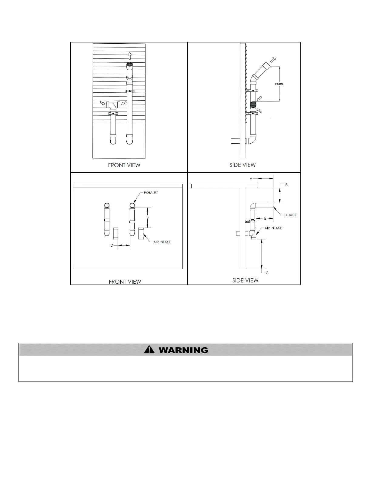 B. Typical installations require 12” minimum separation between bottom of exhaust outlet and top of air intake.