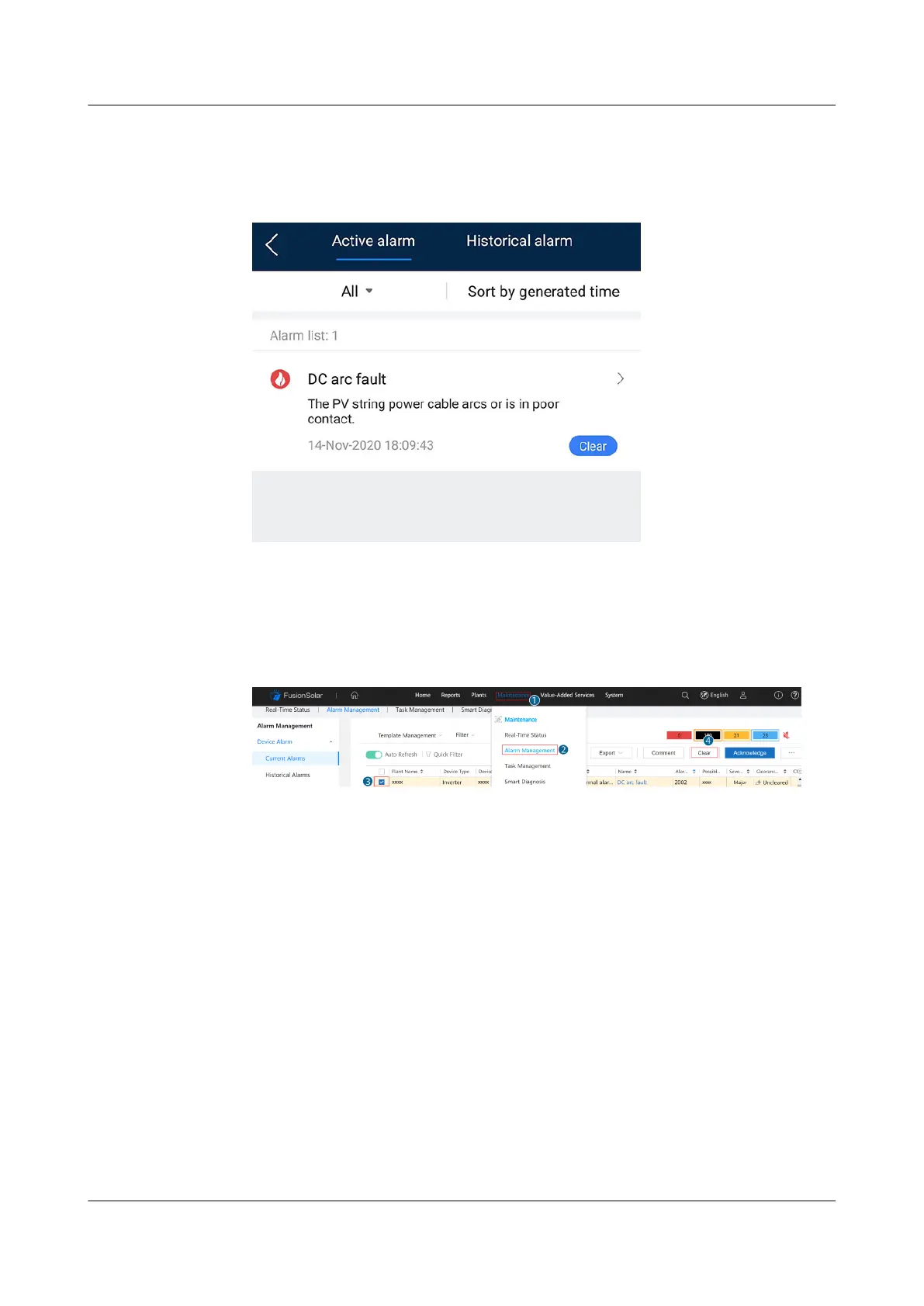account, choose Maintenance > Alarm Management, select the DC arc fault