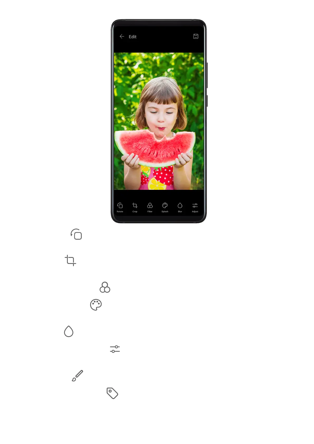 • Adjust photo eects: Touch to adjust the brightness, contrast, saturation, and other